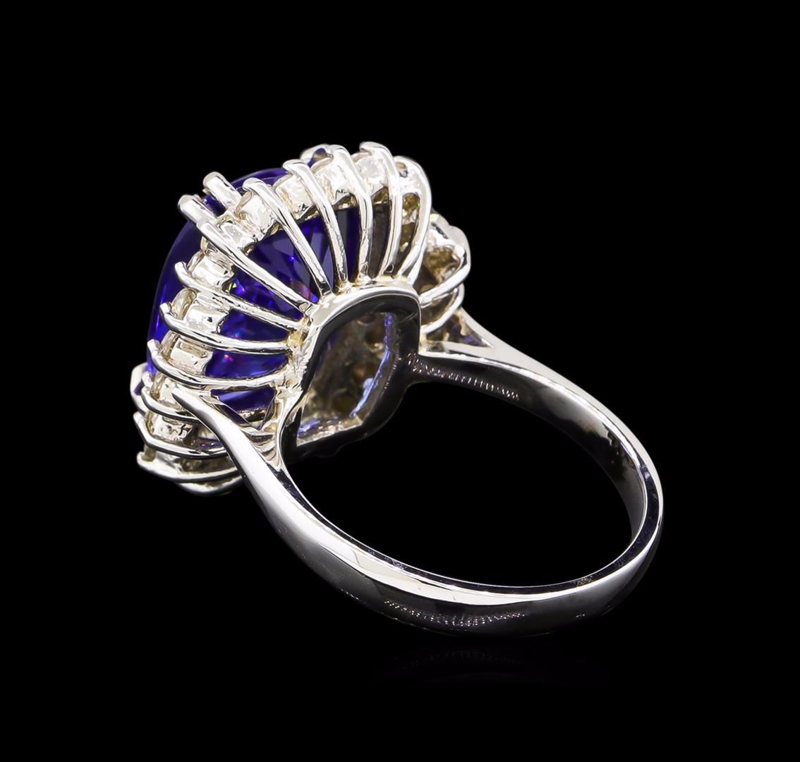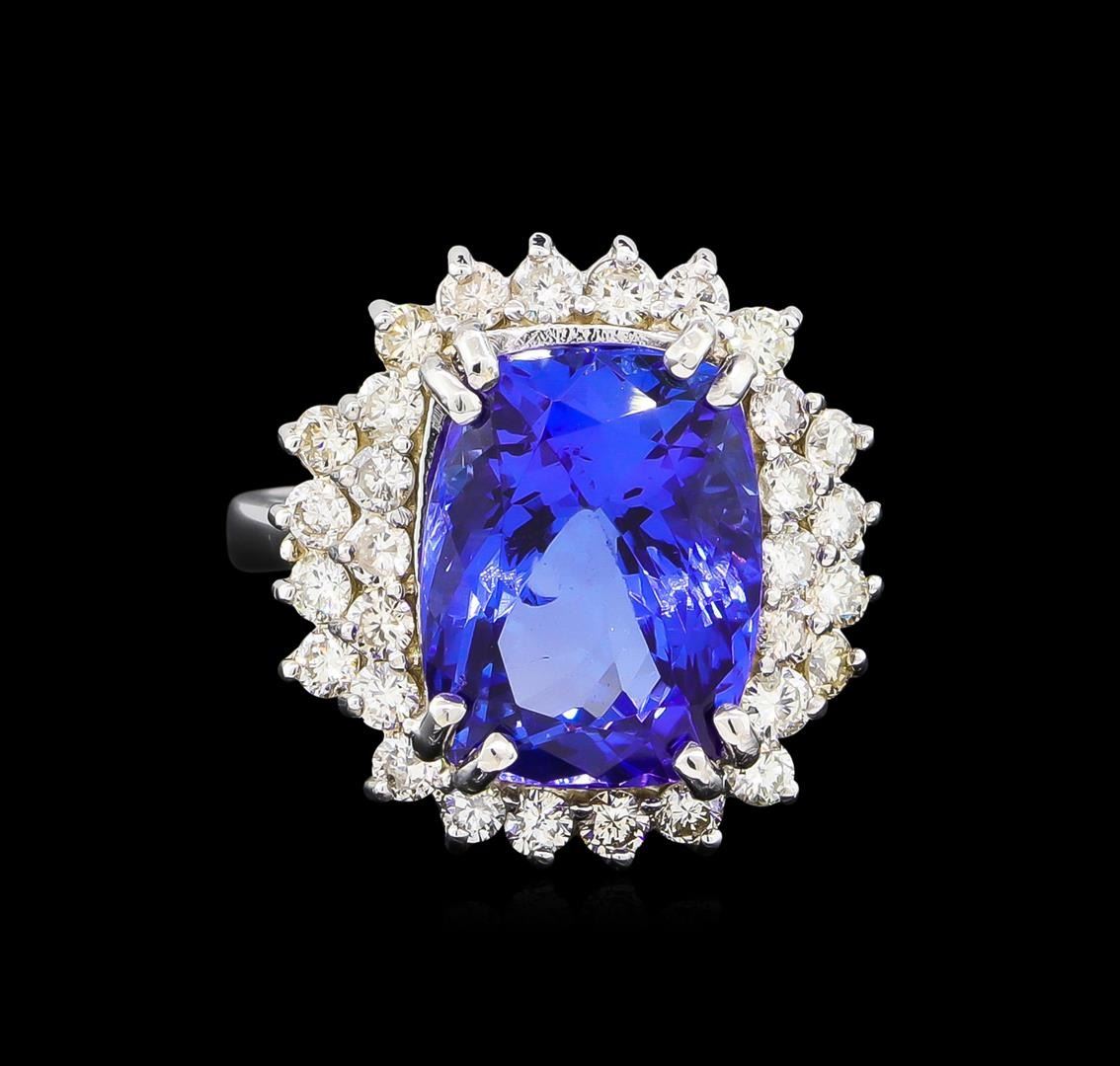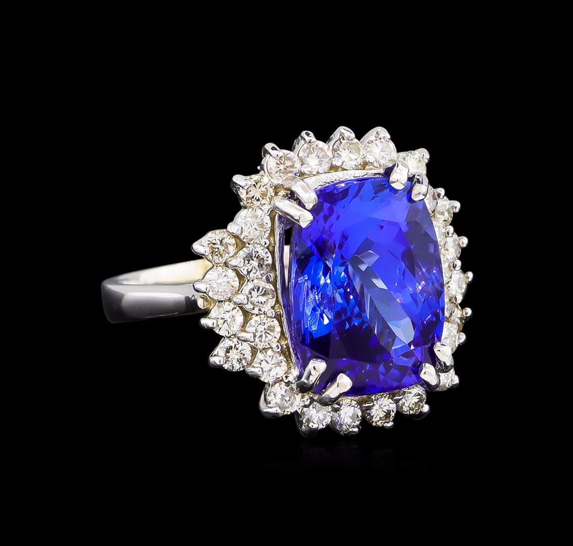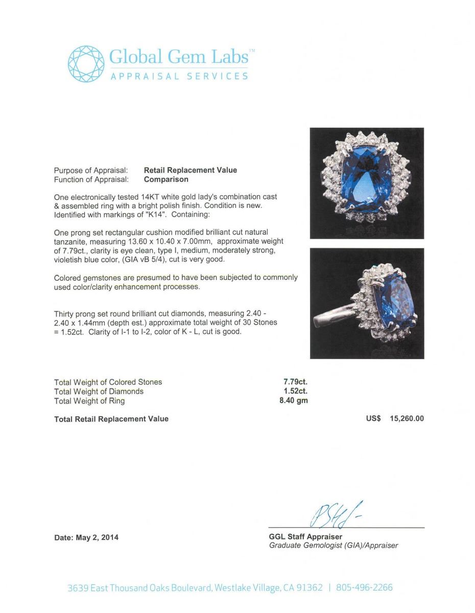 One electronically tested 14KT white gold Ladies combination cast & assembled ring with a bright polish finish. Condition is new. Identified with markings of "K14". Containing: One prong set rectangular cushion modified brilliant cut natural tanzanite, measuring 13.60 x 10.40 x 7.00mm, approximate weight of 7.79ct., clarity is eye clean, type I, medium, moderately strong, violetish blue color, (GIA vB 5/4), cut is very good. Colored gemstones are presumed to have been subjected to commonly used color/clarity enhancement processes. Thirty prong set round brilliant cut diamonds, measuring 2.40 - 2.40 x 1.44mm (depth est.) approximate. Total Weight of 30 Stones = 1.52ct. Clarity: I-1 to I-2. Color: K - L, Cut is Good. Total Weight of Colored Stones 7.79ct. Total Weight of Diamonds 1.52ct. Total Weight of Ring 8.40 grams. GGL Appraised at $15,260.00.