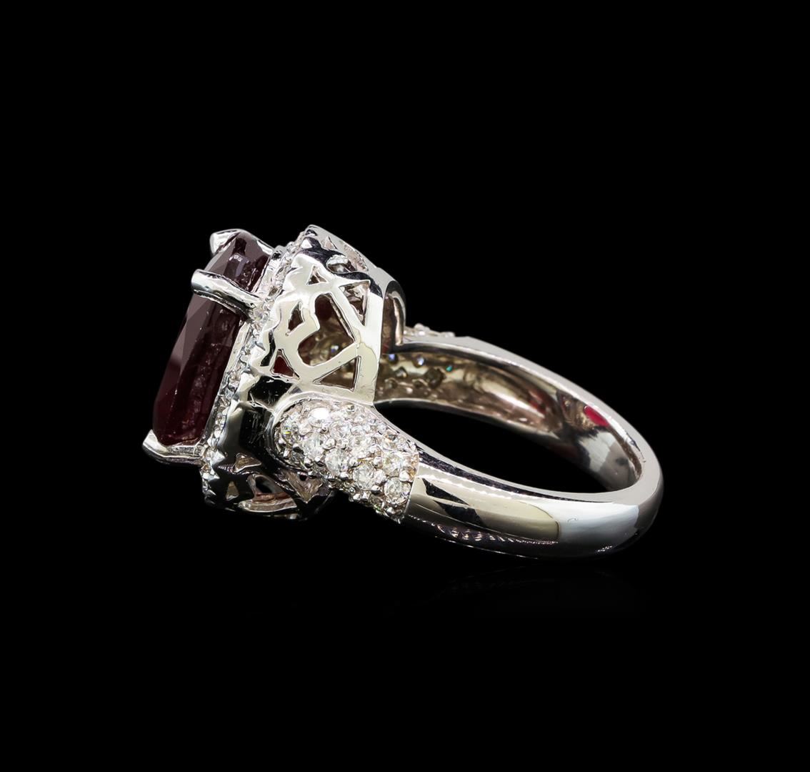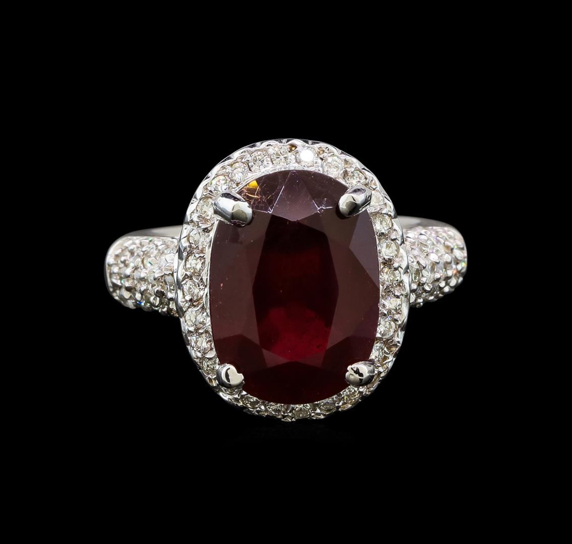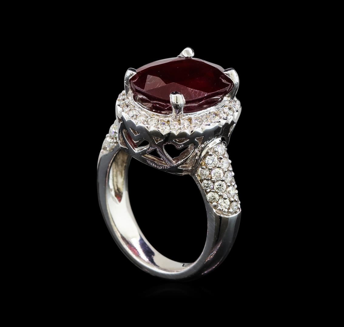 One electronically tested 14KT white gold ladies cast ruby and diamond ring with a bright polish finish. Condition is new. Containing: One prong set oval modified brilliant cut natural ruby, measuring 14.00 x 10.10 x 6.57mm, approximate weight of 7.90ct., clarity is heavily included, medium dark, strong, purple red color, (GIA PR 6/5), cut is good. Seventy-Two prong set round brilliant cut diamonds, measuring 1.40 - 1.40 x 0.84mm (depth est.) approximate total weight of 72 Stones = 0.72ct. Clarity: SI-2 to I-1. Color: I - J, Cut is Good. Colored gemstones are presumed to have been subjected to commonly used enhancement processes. All diamonds and colored gemstones are graded in the mounting, unless otherwise stated. Total Weight of Colored Stones 7.90ct. Total Weight of Diamonds 0.72ct. Total Weight of Ring 9.80 grams. GGL Appraised at $4,510.00.