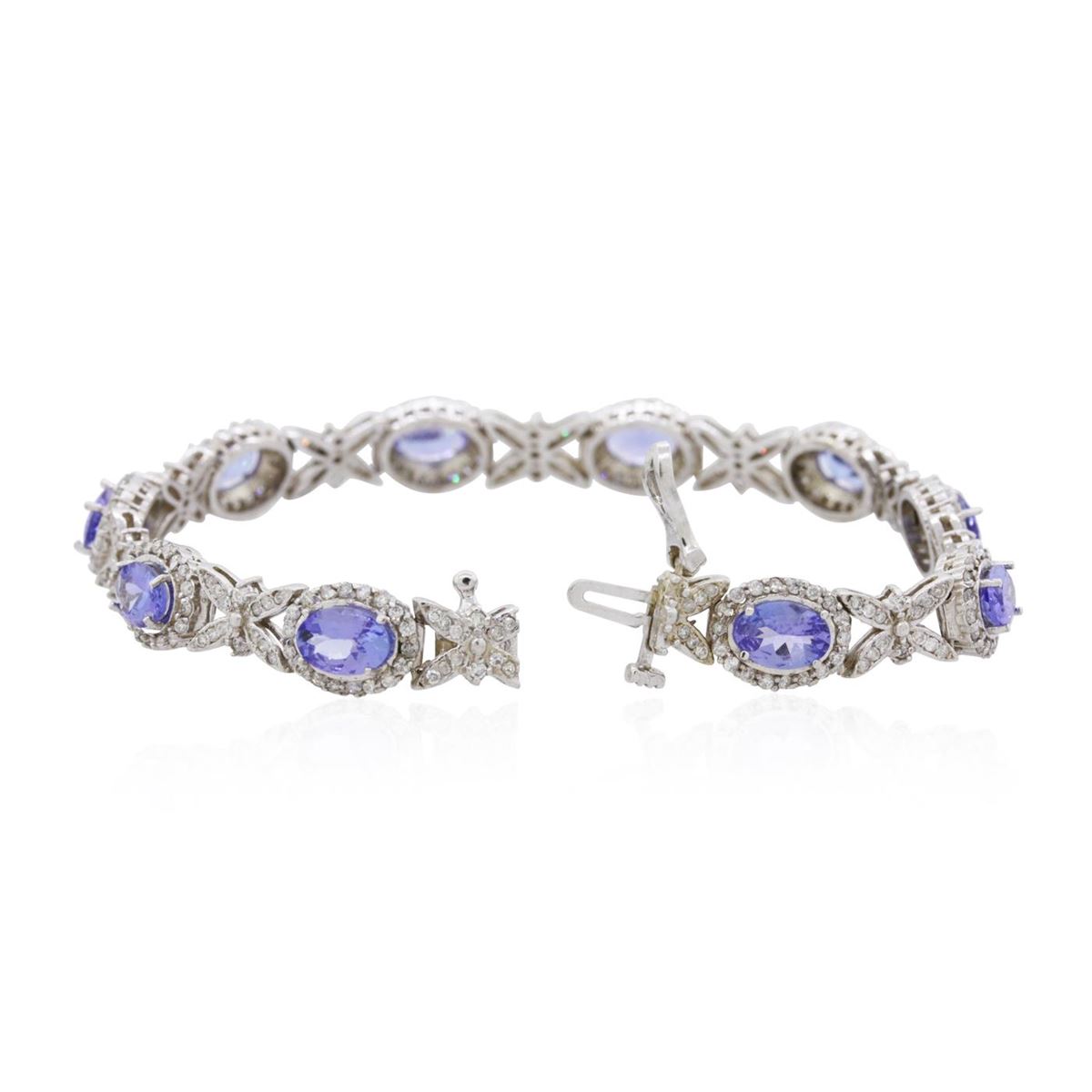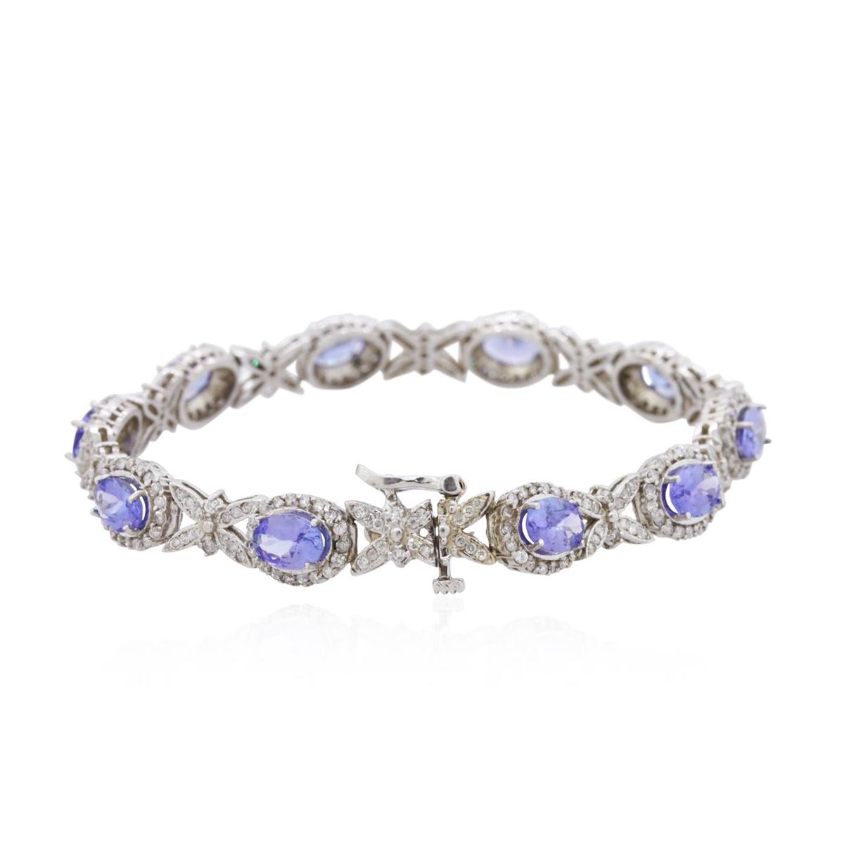 One electronically tested 14KT white gold ladies combination cast & assembled tanzanite and diamond bracelet with a bright polish finish. Measurements: 7.25" in length. Identified with markings of "14K". Condition is new. Containing: Ten prong set oval modified brilliant cut natural tanzanites, measuring 7.08 x 4.62 x 3.43mm, approximate total weight of 7.90ct., clarity is moderately included, type I, medium light, very slightly grayish, violet color, (GIA V 4/3), cut is good. Three Hundred Twenty-Four prong set round brilliant cut diamonds, measuring 1.10 - 1.10 x 0.66mm (depth est.) approximate total weight of 324 Stones = 1.56ct. Clarity: I-1 to I-2. Color: I - J, Cut is Good. Colored gemstones are presumed to have been subjected to commonly used enhancement processes. All diamonds and colored gemstones are graded in the mounting, unless otherwise stated. Total Weight of Colored Stones 7.90ct. Total Weight of Diamonds 1.56ct. Total Weight of Bracelet 17.40 grams. GGL Appraised at $9,680.00.