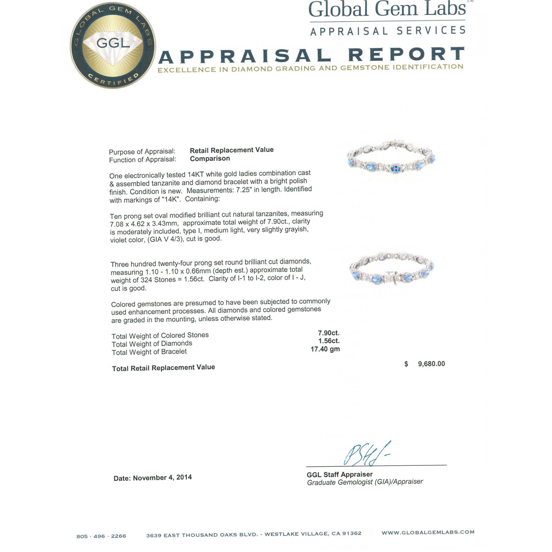 One electronically tested 14KT white gold ladies combination cast & assembled tanzanite and diamond bracelet with a bright polish finish. Measurements: 7.25" in length. Identified with markings of "14K". Condition is new. Containing: Ten prong set oval modified brilliant cut natural tanzanites, measuring 7.08 x 4.62 x 3.43mm, approximate total weight of 7.90ct., clarity is moderately included, type I, medium light, very slightly grayish, violet color, (GIA V 4/3), cut is good. Three Hundred Twenty-Four prong set round brilliant cut diamonds, measuring 1.10 - 1.10 x 0.66mm (depth est.) approximate total weight of 324 Stones = 1.56ct. Clarity: I-1 to I-2. Color: I - J, Cut is Good. Colored gemstones are presumed to have been subjected to commonly used enhancement processes. All diamonds and colored gemstones are graded in the mounting, unless otherwise stated. Total Weight of Colored Stones 7.90ct. Total Weight of Diamonds 1.56ct. Total Weight of Bracelet 17.40 grams. GGL Appraised at $9,680.00.