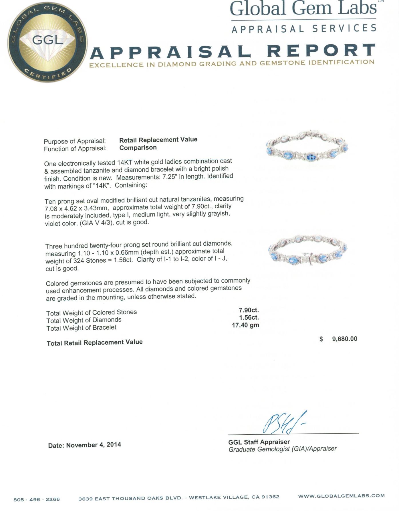 One electronically tested 14KT white gold ladies combination cast & assembled tanzanite and diamond bracelet with a bright polish finish. Measurements: 7.25" in length. Identified with markings of "14K". Condition is new. Containing: Ten prong set oval modified brilliant cut natural tanzanites, measuring 7.08 x 4.62 x 3.43mm, approximate total weight of 7.90 ct., clarity is moderately included, type I, medium light, very slightly grayish, violet color, (GIA V 4/3), cut is good. Three Hundred Twenty-Four prong set round brilliant cut diamonds, measuring 1.10 - 1.10 x 0.66mm (depth est.) approximate total weight of 324 Stones = 1.56ct. Clarity: I-1 to I-2. Color: I - J, Cut is Good. Colored gemstones are presumed to have been subjected to commonly used enhancement processes. All diamonds and colored gemstones are graded in the mounting, unless otherwise stated. Total Weight of Colored Stones 7.90 ct. Total Weight of Diamonds 1.56ct. Total Weight of Bracelet 17.40 grams. GGL Appraised.