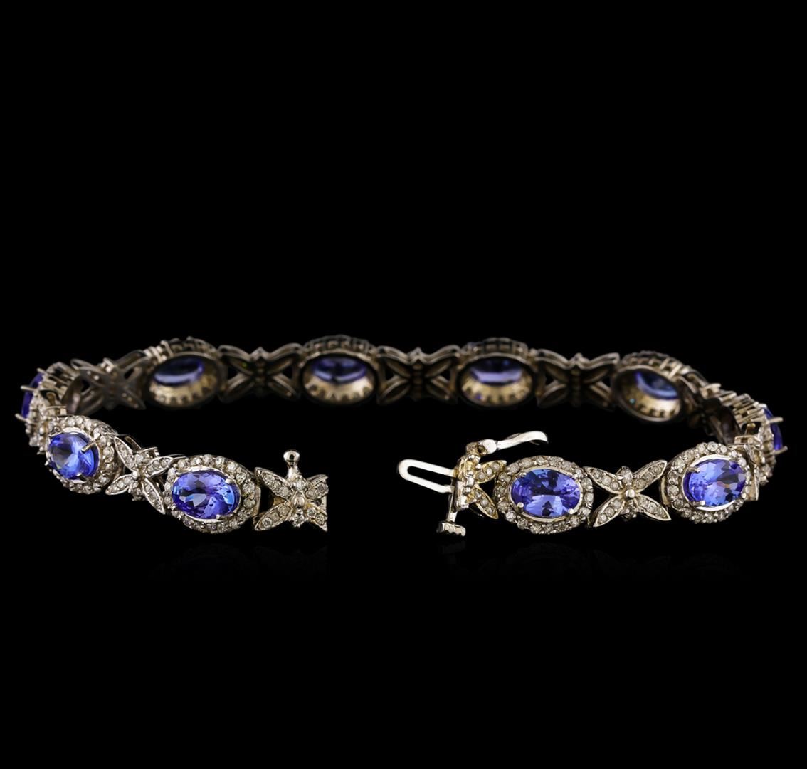 One electronically tested 14KT white gold ladies combination cast & assembled tanzanite and diamond bracelet with a bright polish finish. Measurements: 7.25" in length. Identified with markings of "14K". Condition is new. Containing: Ten prong set oval modified brilliant cut natural tanzanites, measuring 7.08 x 4.62 x 3.43mm, approximate total weight of 7.90 ct., clarity is moderately included, type I, medium light, very slightly grayish, violet color, (GIA V 4/3), cut is good. Three Hundred Twenty-Four prong set round brilliant cut diamonds, measuring 1.10 - 1.10 x 0.66mm (depth est.) approximate total weight of 324 Stones = 1.56ct. Clarity: I-1 to I-2. Color: I - J, Cut is Good. Colored gemstones are presumed to have been subjected to commonly used enhancement processes. All diamonds and colored gemstones are graded in the mounting, unless otherwise stated. Total Weight of Colored Stones 7.90 ct. Total Weight of Diamonds 1.56ct. Total Weight of Bracelet 17.40 grams. GGL Appraised.