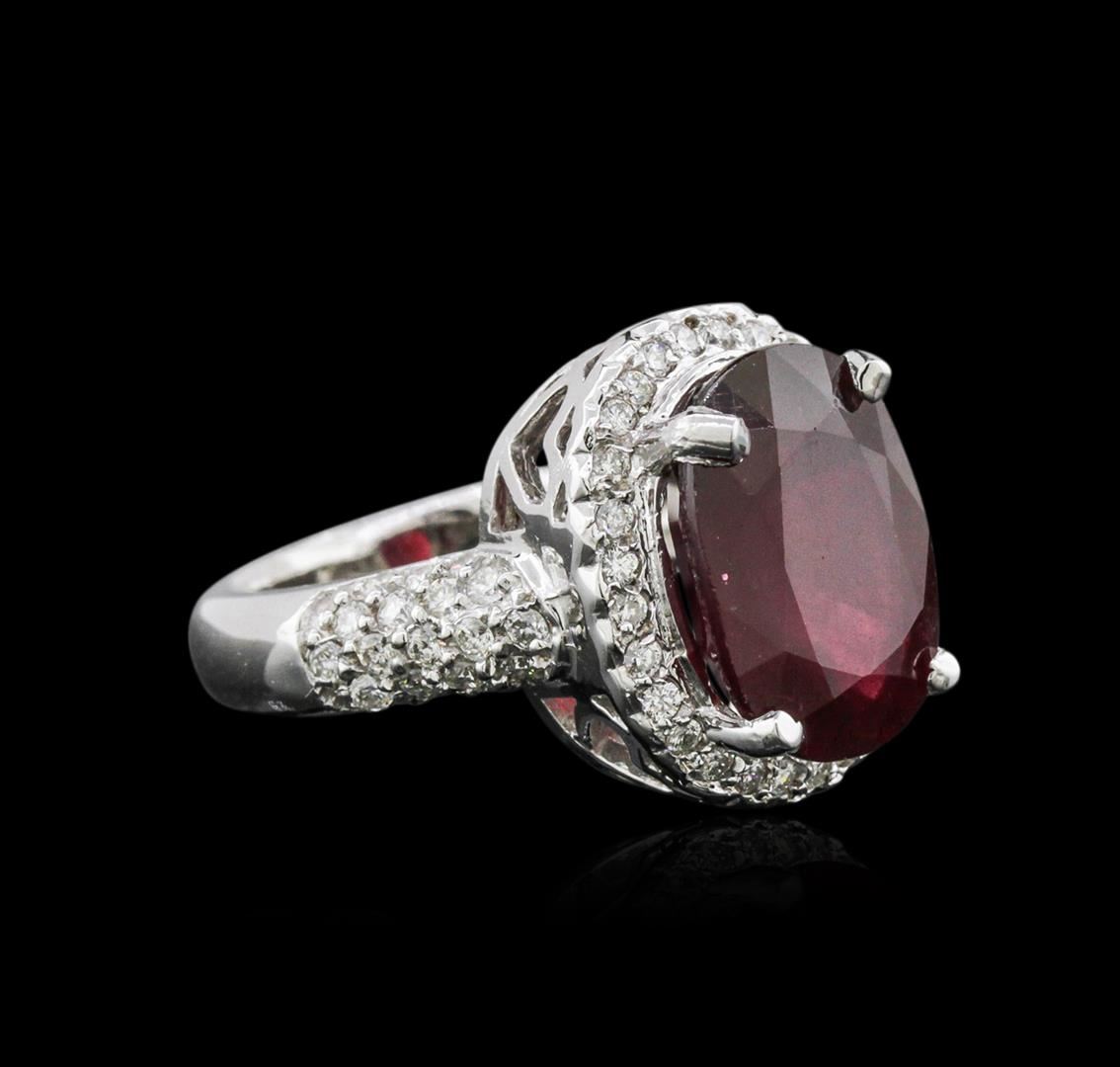 One electronically tested 14KT white gold ladies cast ruby and diamond ring with a bright polish finish. Condition is new. Containing: One prong set oval modified brilliant cut natural ruby, measuring 14.00 x 10.10 x 6.57mm, approximate weight of 7.90ct., clarity is heavily included, medium dark, strong, purple red color, (GIA PR 6/5), cut is good. Seventy-Two prong set round brilliant cut diamonds, measuring 1.40 - 1.40 x 0.84mm (depth est.) approximate total weight of 72 Stones = 0.72ct. Clarity: SI-2 to I-1. Color: I - J, Cut is Good. Colored gemstones are presumed to have been subjected to commonly used enhancement processes. All diamonds and colored gemstones are graded in the mounting, unless otherwise stated. Total Weight of Colored Stones 7.90ct. Total Weight of Diamonds 0.72ct. Total Weight of Ring 9.80 grams. GGL Appraised at $4,510.00.