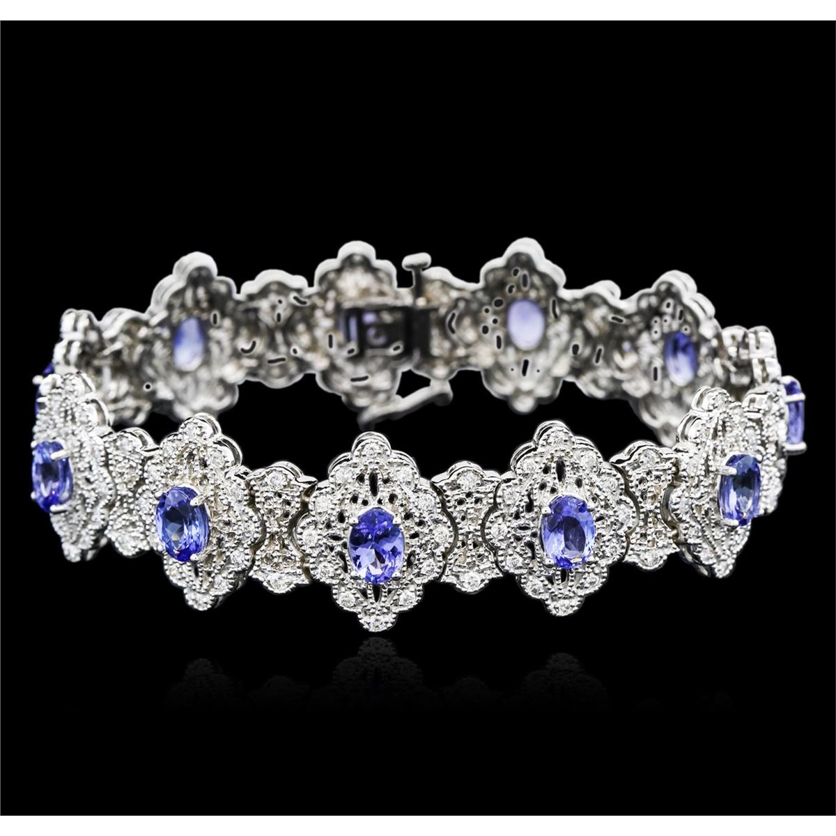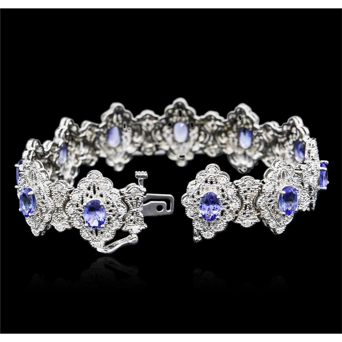 One electronically tested 14KT white gold ladies cast tanzanite and diamond bracelet with a hidden box clasp with a bright polish finish. Measurements: 7.25" in length Condition is new. Containing: Eleven prong set oval modified brilliant cut natural tanzanites, measuring 6.80 x 4.80 x 3.12mm, approximate total weight of 7.92ct., clarity is eye clean, type I, medium light, very slightly grayish, violet color, (GIA V 4/3), cut is good. One Hundred Fifty-Four prong set round brilliant cut diamonds, measuring 1.30 - 1.30 x 0.78mm (depth est.) approximate total weight of 154 Stones = 1.23ct. Clarity: SI-1 to SI-2. Color: I - J, Cut is Good. Colored gemstones are presumed to have been subjected to commonly used enhancement processes. All diamonds and colored gemstones are graded in the mounting, unless otherwise stated. Total Weight of Colored Stones 7.92ct. Total Weight of Diamonds 1.23ct. Total Weight of Bracelet 32.60 grams. GGL Appraised at $14,790.00.