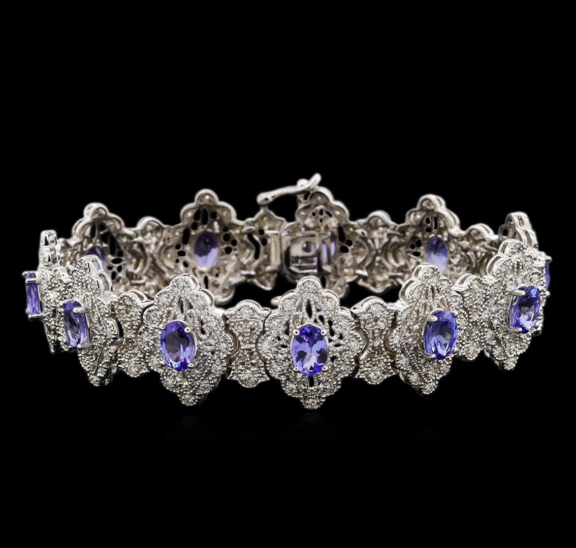 One electronically tested 14KT white gold ladies cast tanzanite and diamond bracelet with a hidden box clasp with a bright polish finish. Measurements: 7.25" in length Condition is new. Containing: Eleven prong set oval modified brilliant cut natural tanzanites, measuring 6.80 x 4.80 x 3.12mm, approximate total weight of 7.92ct., clarity is eye clean, type I, medium light, very slightly grayish, violet color, (GIA V 4/3), cut is good. One Hundred Fifty-Four prong set round brilliant cut diamonds, measuring 1.30 - 1.30 x 0.78mm (depth est.) approximate total weight of 154 Stones = 1.23ct. Clarity: SI-1 to SI-2. Color: I - J, Cut is Good. Colored gemstones are presumed to have been subjected to commonly used enhancement processes. All diamonds and colored gemstones are graded in the mounting, unless otherwise stated. Total Weight of Colored Stones 7.92ct. Total Weight of Diamonds 1.23ct. Total Weight of Bracelet 32.60 grams. GGL Appraised at $14,790.00.
