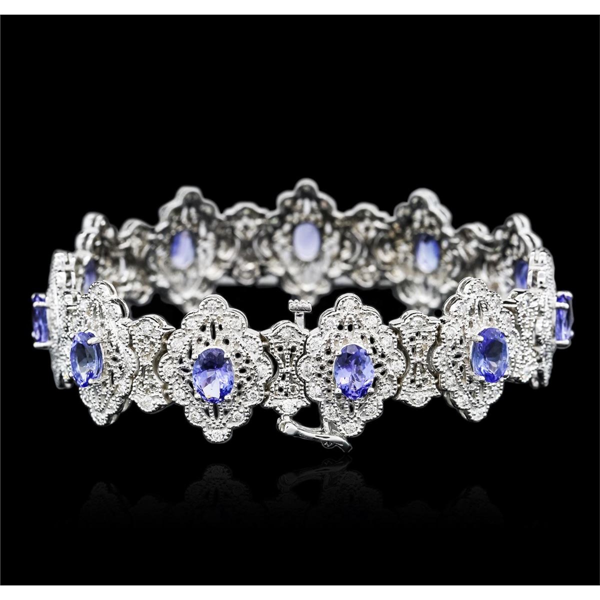 One electronically tested 14KT white gold ladies cast tanzanite and diamond bracelet with a hidden box clasp with a bright polish finish. Measurements: 7.25" in length Condition is new. Containing: Eleven prong set oval modified brilliant cut natural tanzanites, measuring 6.80 x 4.80 x 3.12mm, approximate total weight of 7.92ct., clarity is eye clean, type I, medium light, very slightly grayish, violet color, (GIA V 4/3), cut is good. One Hundred Fifty-Four prong set round brilliant cut diamonds, measuring 1.30 - 1.30 x 0.78mm (depth est.) approximate total weight of 154 Stones = 1.23ct. Clarity: SI-1 to SI-2. Color: I - J, Cut is Good. Colored gemstones are presumed to have been subjected to commonly used enhancement processes. All diamonds and colored gemstones are graded in the mounting, unless otherwise stated. Total Weight of Colored Stones 7.92ct. Total Weight of Diamonds 1.23ct. Total Weight of Bracelet 32.60 grams. GGL Appraised at $14,790.00.