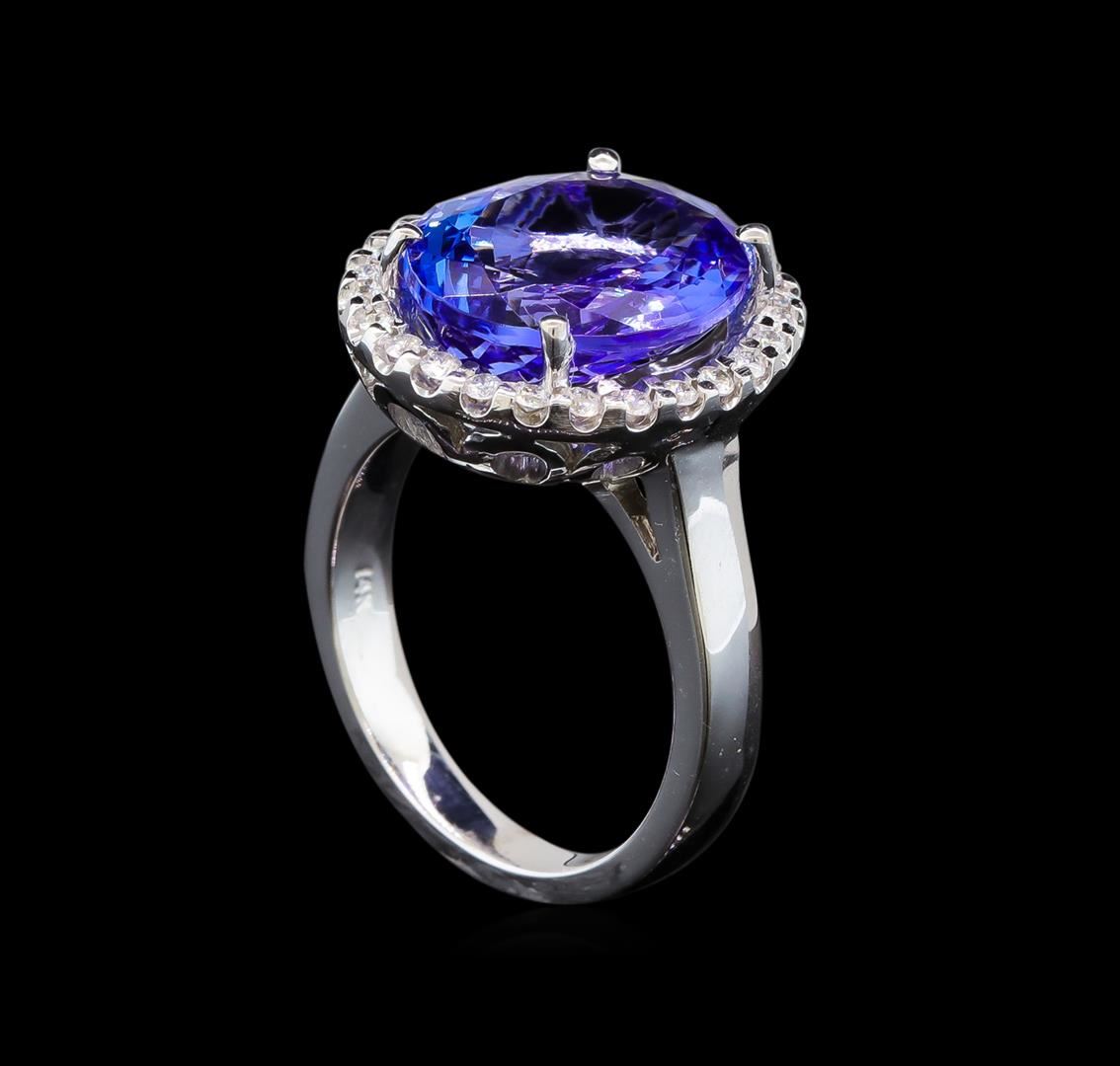 One electronically tested 14KT white gold ladies cast tanzanite and diamond ring with a bright polish finish. Identified with markings of "14K". Condition is new. Containing: One prong set oval modified brilliant cut natural tanzanite, measuring 13.95 x 11.18 x 7.27mm, approximate weight of 7.98ct., clarity is eye clean, type I, medium, very slightly grayish, violet color, (GIA V 5/3), cut is good. Twenty-Six prong set round brilliant cut diamonds, measuring 1.30 - 1.30 x 0.78mm (depth est.) approximate total weight of 26 Stones = 0.21ct. Clarity: I-1 to I-2. Color: H - I, Cut is Good. Colored gemstones are presumed to have been subjected to commonly used enhancement processes. All diamonds and colored gemstones are graded in the mounting, unless otherwise stated. Total Weight of Colored Stones 7.98ct. Total Weight of Diamonds 0.21ct. Total Weight of Ring 8.70 grams. GGL Appraised at $7,570.00.