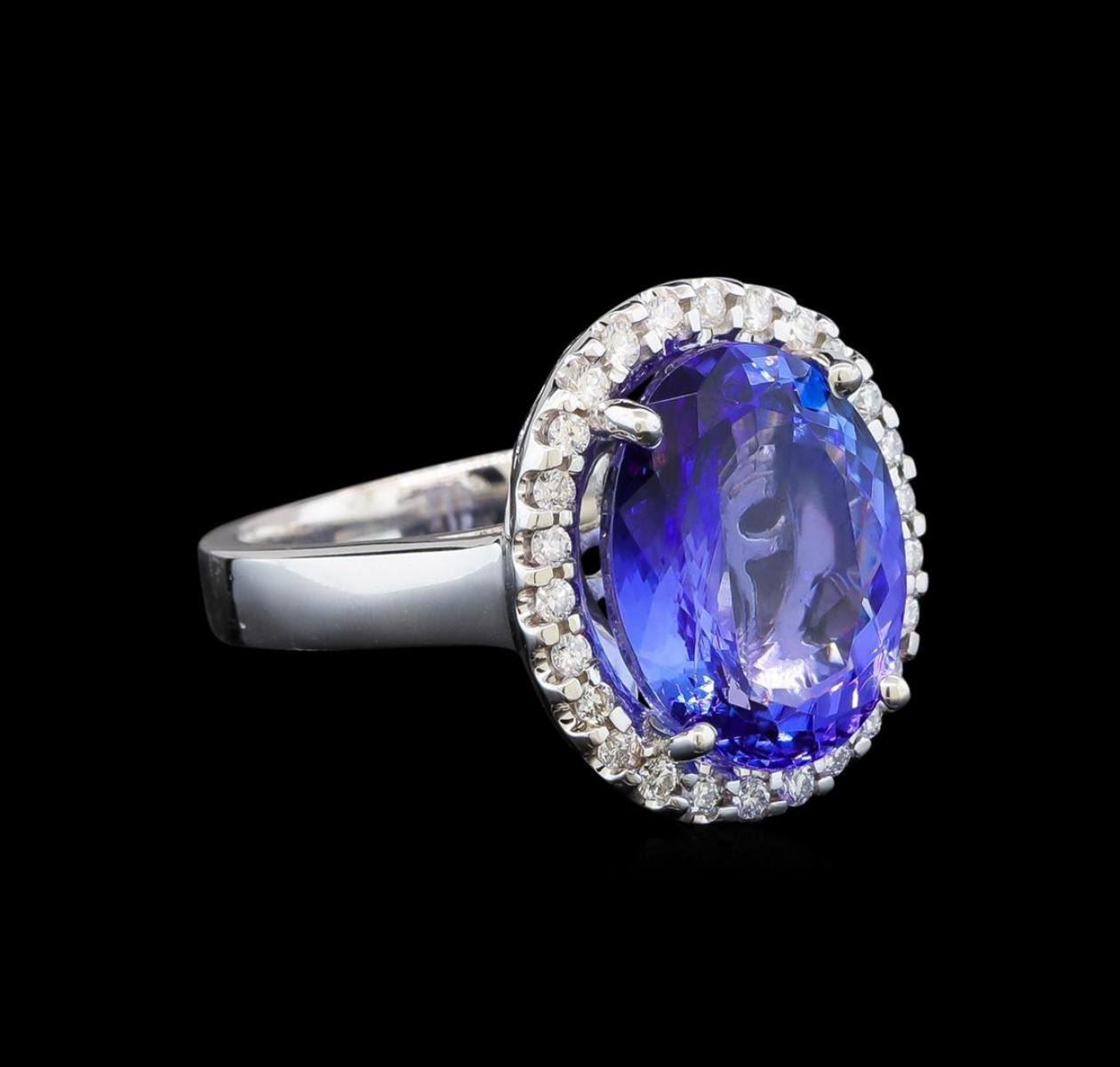 One electronically tested 14KT white gold ladies cast tanzanite and diamond ring with a bright polish finish. Identified with markings of "14K". Condition is new. Containing: One prong set oval modified brilliant cut natural tanzanite, measuring 13.95 x 11.18 x 7.27mm, approximate weight of 7.98ct., clarity is eye clean, type I, medium, very slightly grayish, violet color, (GIA V 5/3), cut is good. Twenty-Six prong set round brilliant cut diamonds, measuring 1.30 - 1.30 x 0.78mm (depth est.) approximate total weight of 26 Stones = 0.21ct. Clarity: I-1 to I-2. Color: H - I, Cut is Good. Colored gemstones are presumed to have been subjected to commonly used enhancement processes. All diamonds and colored gemstones are graded in the mounting, unless otherwise stated. Total Weight of Colored Stones 7.98ct. Total Weight of Diamonds 0.21ct. Total Weight of Ring 8.70 grams. GGL Appraised.