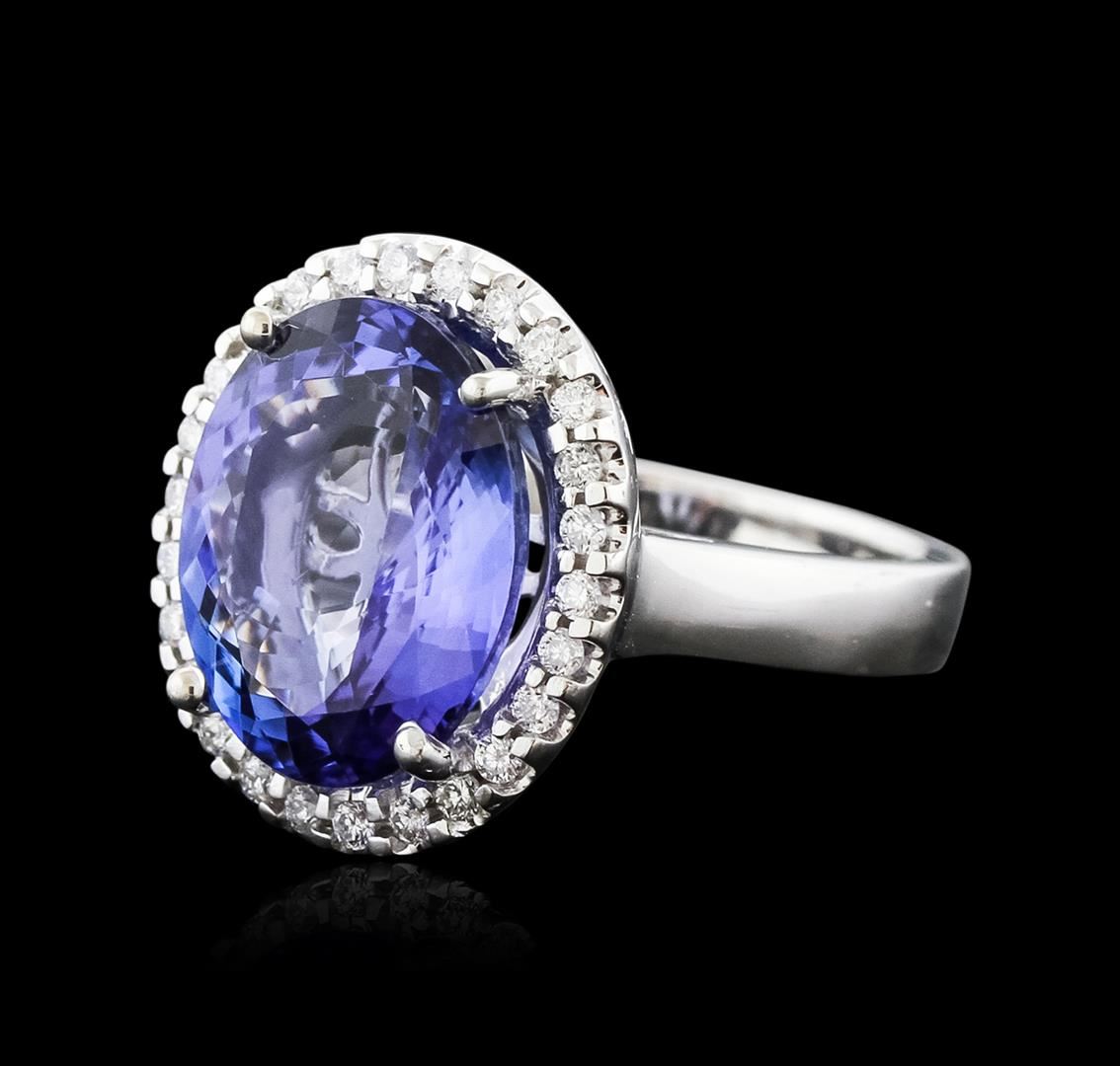 One electronically tested 14KT white gold ladies cast tanzanite and diamond ring with a bright polish finish. Identified with markings of "14K". Condition is new. Containing: One prong set oval modified brilliant cut natural tanzanite, measuring 13.95 x 11.18 x 7.27mm, approximate weight of 7.98ct., clarity is eye clean, type I, medium, very slightly grayish, violet color, (GIA V 5/3), cut is good. Twenty-Six prong set round brilliant cut diamonds, measuring 1.30 - 1.30 x 0.78mm (depth est.) approximate total weight of 26 Stones = 0.21ct. Clarity: I-1 to I-2. Color: H - I, Cut is Good. Colored gemstones are presumed to have been subjected to commonly used enhancement processes. All diamonds and colored gemstones are graded in the mounting, unless otherwise stated. Total Weight of Colored Stones 7.98ct. Total Weight of Diamonds 0.21ct. Total Weight of Ring 8.70 grams. GGL Appraised at $7,570.00.