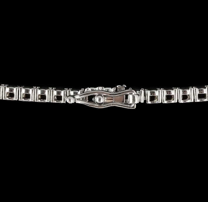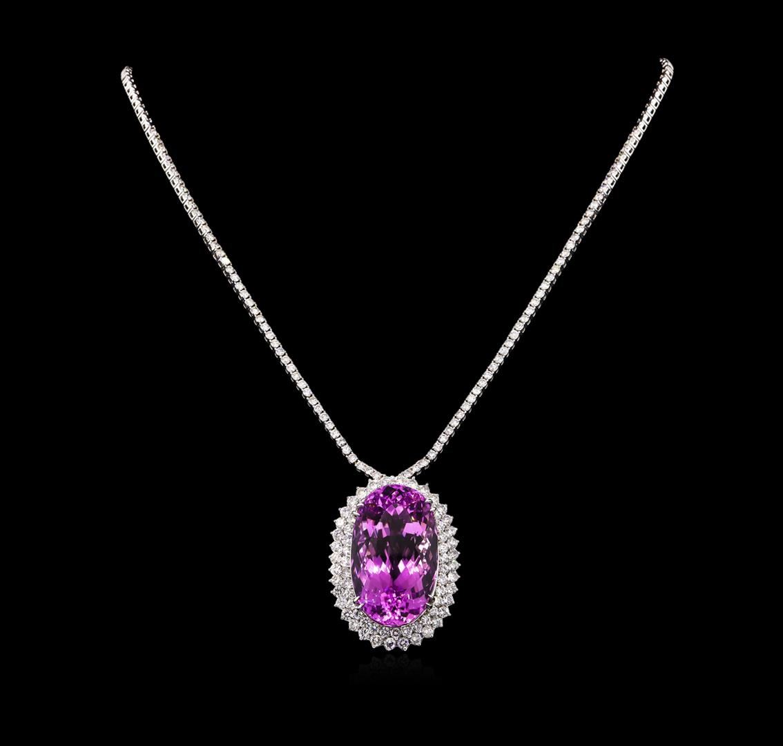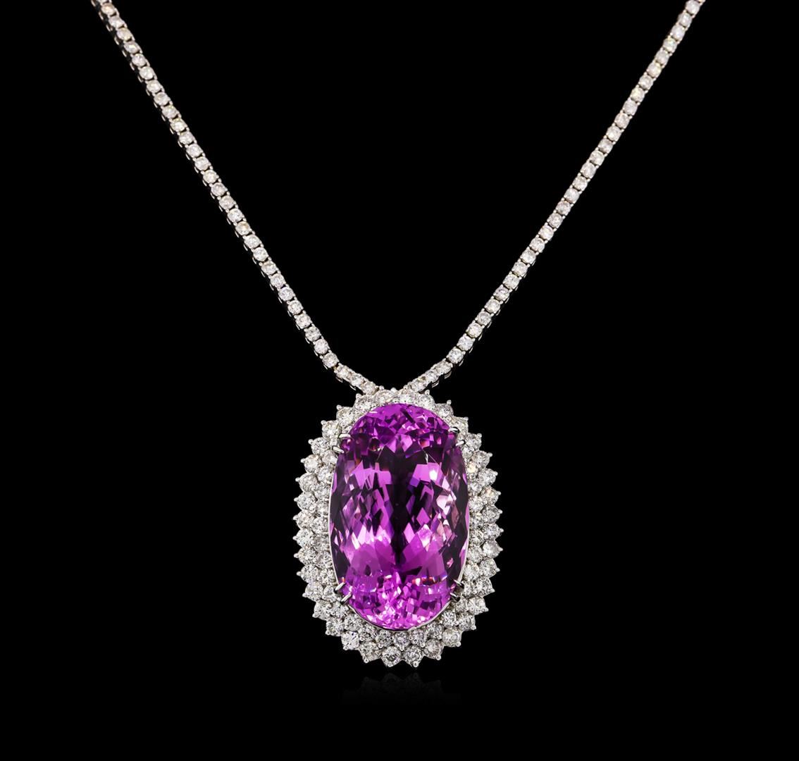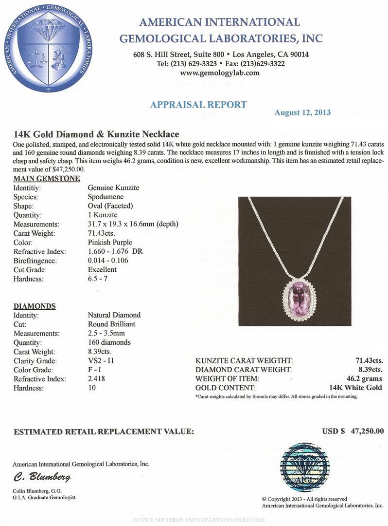 One polished, stamped, and electronically tested solid 14KT White Gold necklace mounted with: 1 genuine kunzite weighing 71.43 carats and 160 genuine round diamonds weighing 8.39 carats. The necklace measures 17 inches in length and is finnished with a tension lock clasp and safety clasp. This item weighs 46.2 grams, condition is new, excellent workmanship. AIGL Appraised at $47,250.00.