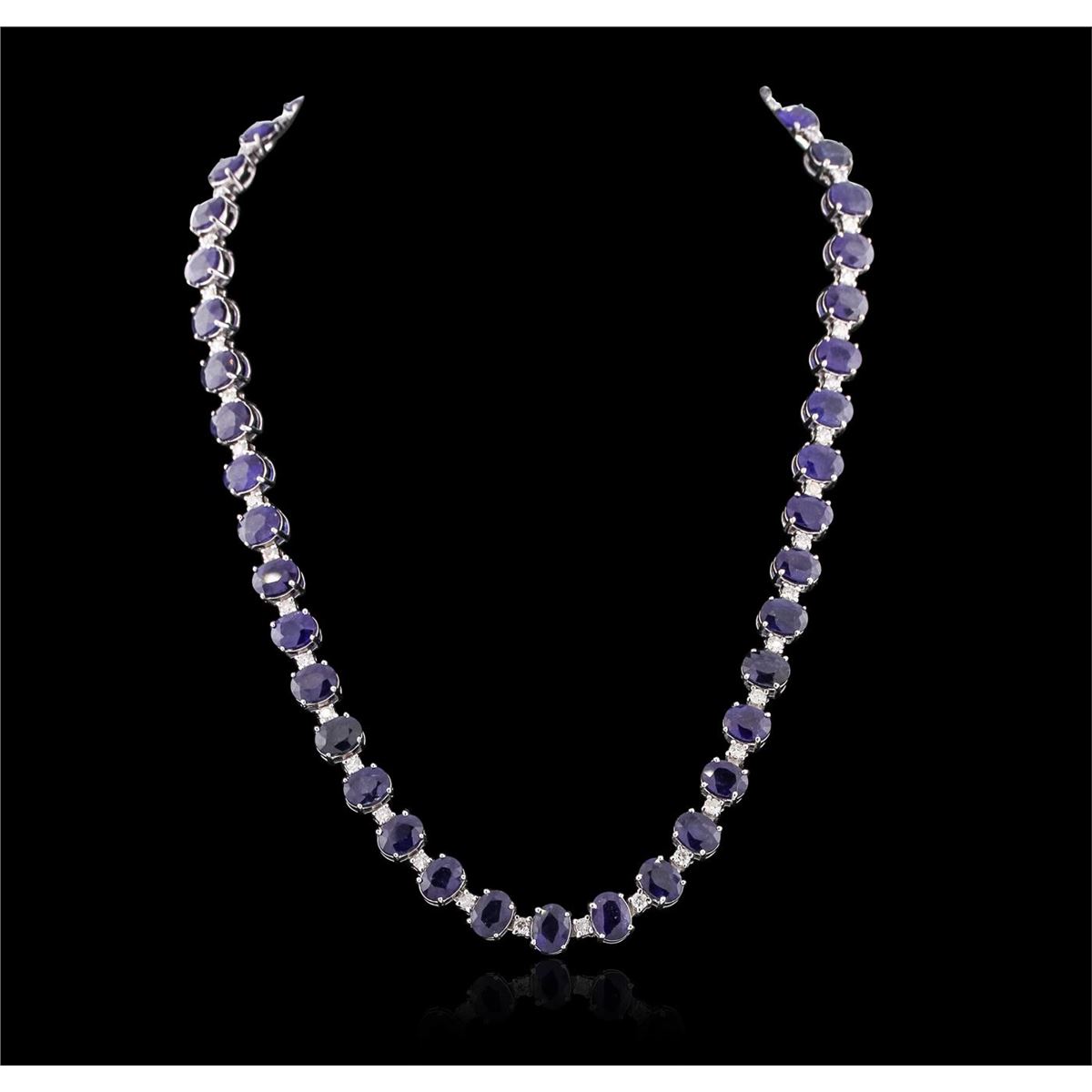 One electronically tested 14KT white gold ladies combination cast & assembled necklace with a hidden box clasp with a bright polish finish. Measurements: 17" in length. Identified with markings of "14K". Condition is new. Containing: Forty-four prong set oval modified brilliant cut natural blue sapphires, measuring 8.09 x 6.31 x 4.00mm, approximate total weight of 73.04ct., clarity is heavily included, type II, medium, moderately strong, strongly purplish red color, (GIA stpR 5/4), cut is good. Forty-Four prong set round brilliant cut diamonds, measuring 2.50 - 2.50 x 1.50mm (depth est.) approximate total weight of 44 Stones = 2.51ct. Clarity: SI-2 to I-2. Color: H - J, Cut is Good. Colored gemstones are presumed to have been subjected to commonly used enhancement processes. All diamonds and colored gemstones are graded in the mounting, unless otherwise stated. Total Weight of Colored Stones 73.04ct. Total Weight of Diamonds 2.51ct. Total Weight of Necklace 49.40 grams. GGL Appraised at $24,250.00.