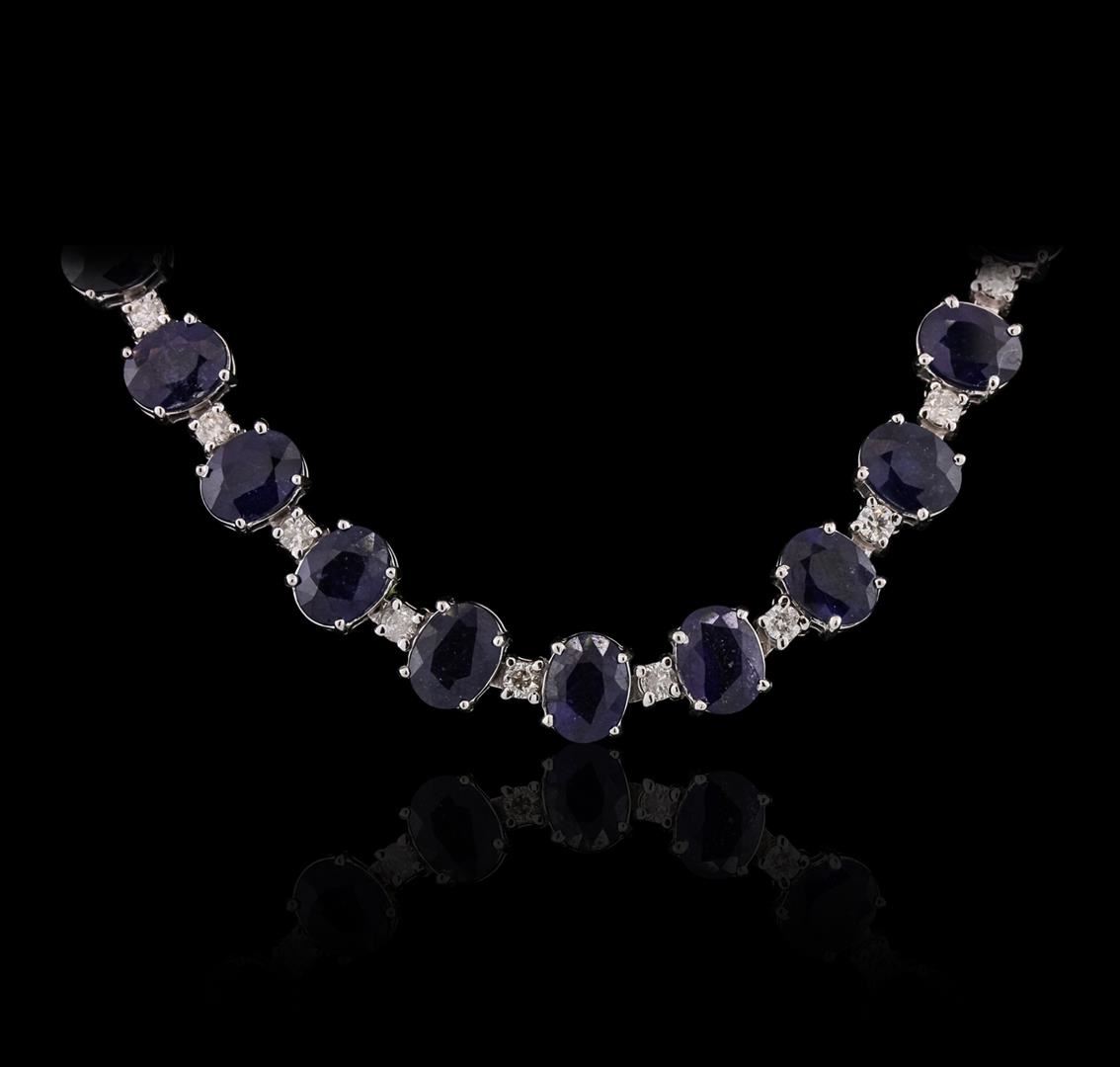One electronically tested 14KT white gold ladies combination cast & assembled necklace with a hidden box clasp with a bright polish finish. Measurements: 17" in length. Identified with markings of "14K". Condition is new. Containing: Forty-four prong set oval modified brilliant cut natural blue sapphires, measuring 8.09 x 6.31 x 4.00mm, approximate total weight of 73.04ct., clarity is heavily included, type II, medium, moderately strong, strongly purplish red color, (GIA stpR 5/4), cut is good. Forty-Four prong set round brilliant cut diamonds, measuring 2.50 - 2.50 x 1.50mm (depth est.) approximate total weight of 44 Stones = 2.51ct. Clarity: SI-2 to I-2. Color: H - J, Cut is Good. Colored gemstones are presumed to have been subjected to commonly used enhancement processes. All diamonds and colored gemstones are graded in the mounting, unless otherwise stated. Total Weight of Colored Stones 73.04ct. Total Weight of Diamonds 2.51ct. Total Weight of Necklace 49.40 grams. GGL Appraised at $24,250.00.