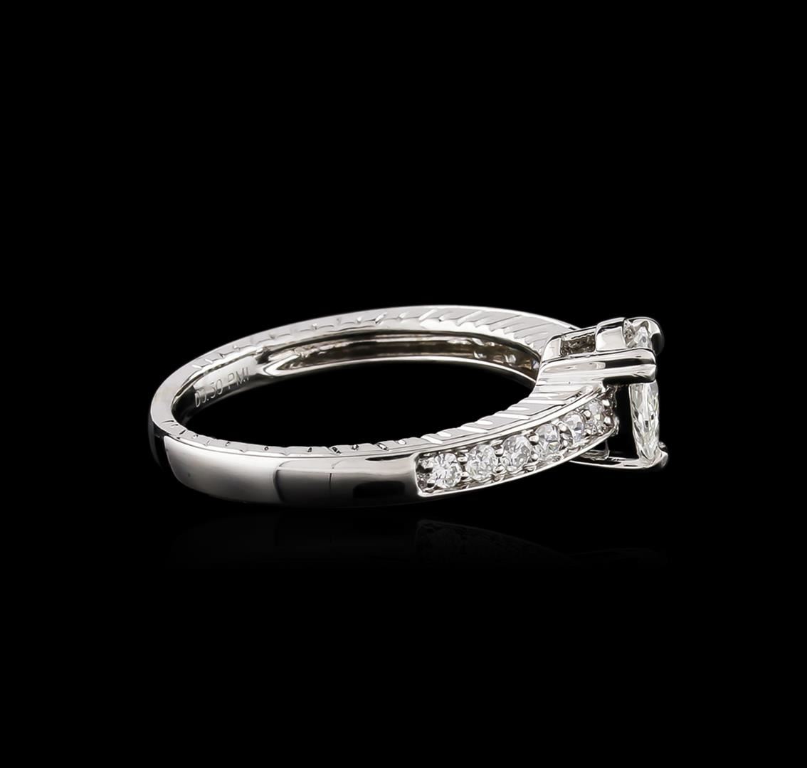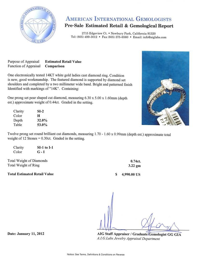 One electronically tested 14KT white gold ladies cast diamond ring. Good workmanship. The featured diamond is supported by diamond set shoulders and completed by a two millimeter wide band. Bright and patterned finish. Identified with markings of "14K". Total weight of diamonds: 0.74cts. Total weight of ring: 3.22gms. AIG Appraised at $4,990.00.