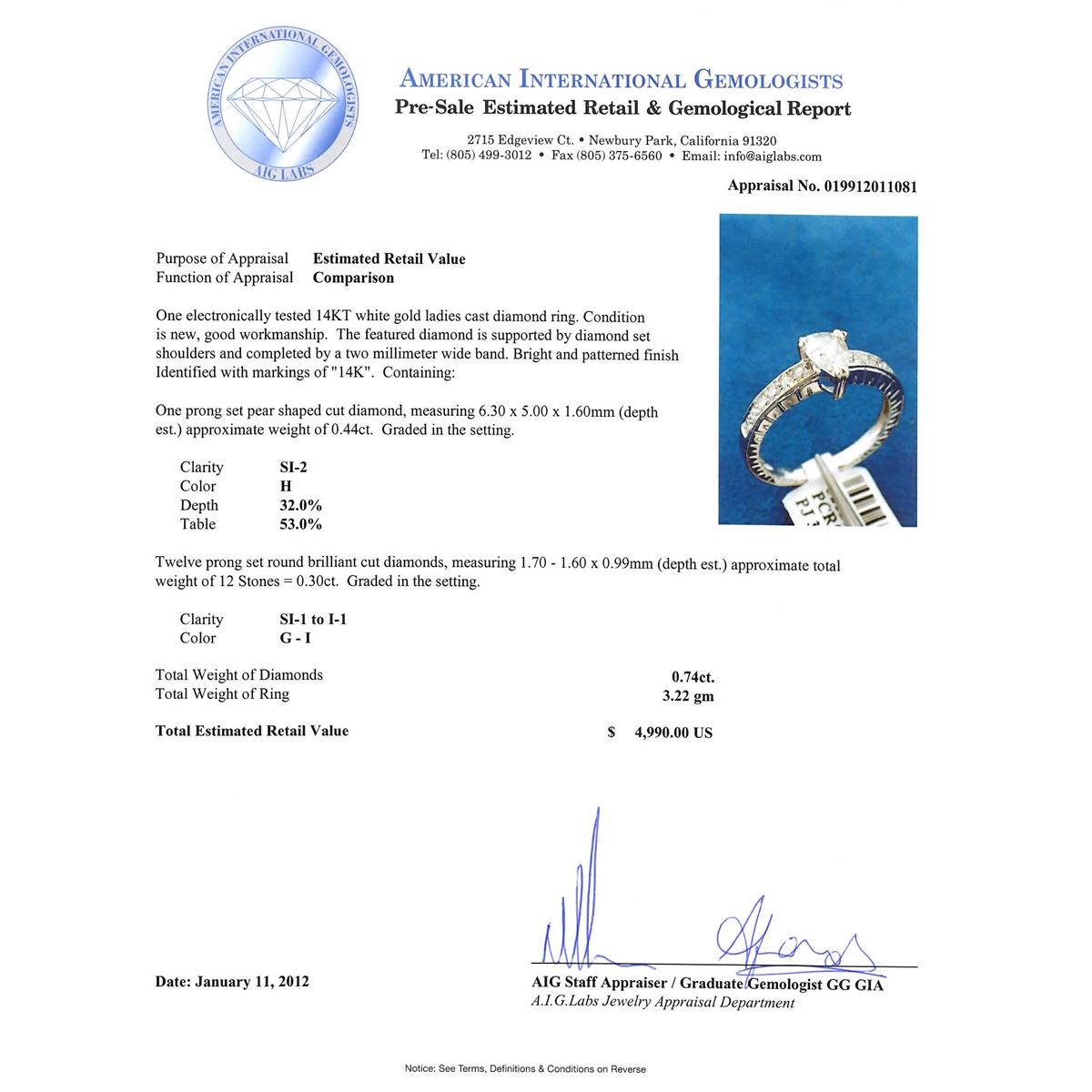 One electronically tested 14KT white gold ladies cast diamond ring. Good workmanship. The featured diamond is supported by diamond set shoulders and completed by a two millimeter wide band. Bright and patterned finish. Identified with markings of "14K". Total weight of diamonds: 0.74cts. Total weight of ring: 3.22gms. AIG Appraised at $4,990.00.