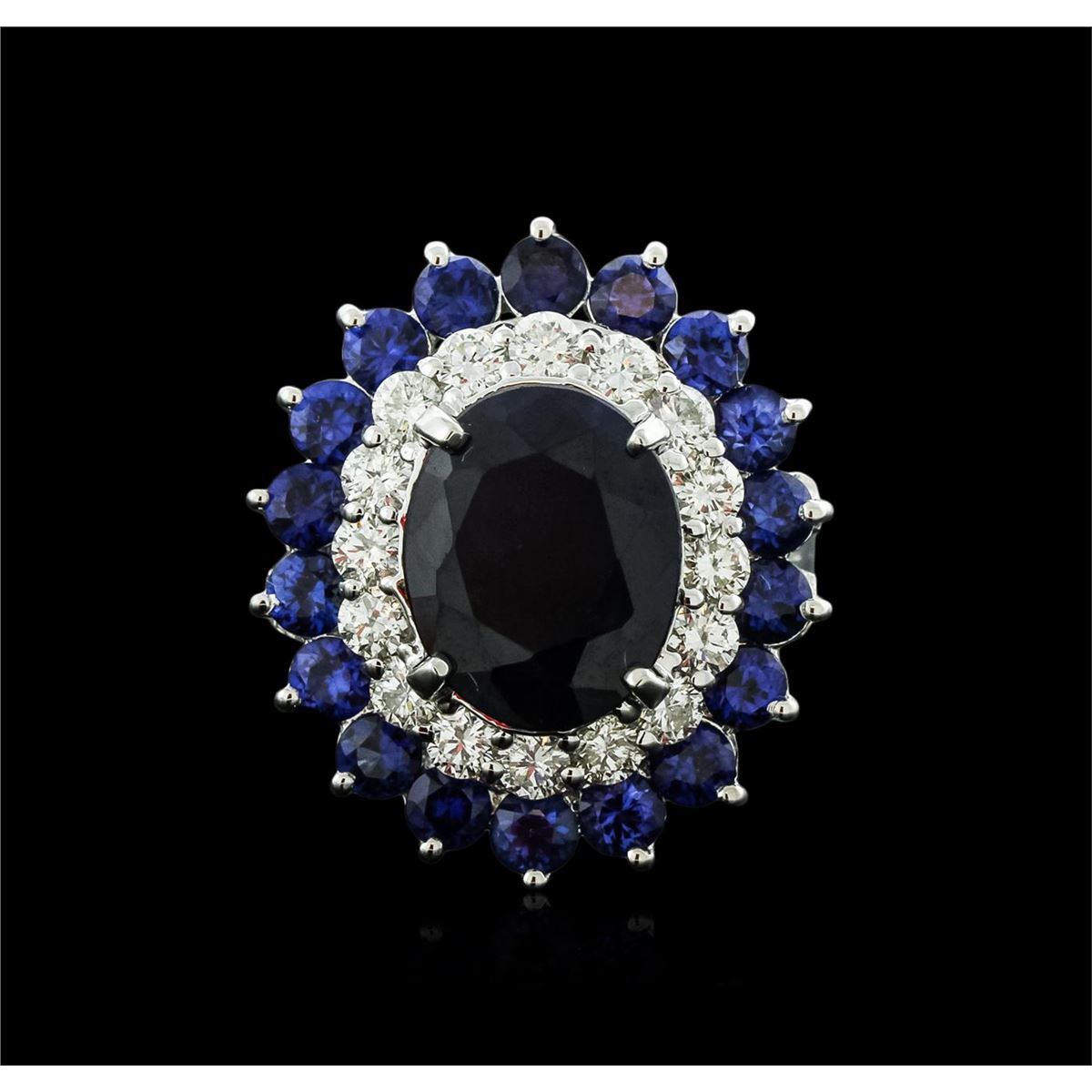 One electronically tested 14KT white gold ladies cast sapphire and diamond ring with a bright polish finish. Identified with markings of "K14". Condition is new. Containing: One prong set oval modified brilliant cut natural blue sapphire, measuring 12.10 x 9.80 x 5.50mm, approximate weight of 5.48ct., clarity is heavily included, type II, dark, strong, blue color, (GIA B 7/5), cut is good. Eighteen prong set round modified brilliant cut natural blue sapphires, measuring 3.00 - 3.00 x 1.95 mm, approximate total weight of 2.52ct., clarity is eye clean, type II, medium dark, moderately strong, blue color, (GIA B 6/4), cut is good. Sixteen prong set round brilliant cut diamonds, measuring 2.50 - 2.50 x 1.50mm (depth est.) approximate total weight of 16 Stones = 0.91ct. Clarity: SI-1 to SI-2. Color: I - J, Cut is Good. Colored gemstones are presumed to have been subjected to commonly used enhancement processes. All diamonds and colored gemstones are graded in the mounting, unless otherwise stated. Total Weight of Colored Stones 8.00ct. Total Weight of Diamonds 0.91ct. Total Weight of Ring 9.70 grams. GGL Appraised at $5,375.00.