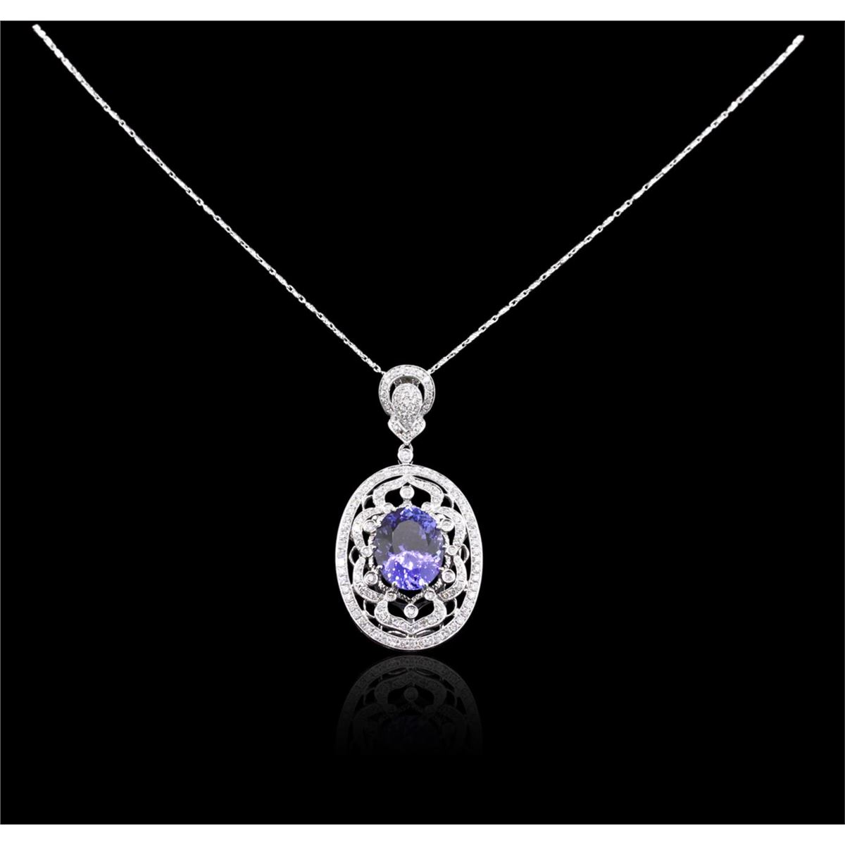 One electronically tested 14KT white gold ladies combination cast & assembled tanzanite and diamond pendant & chain 16.0" long, fancy link with a lobster claw clasp with a bright polish finish. Identified with markings of "585". Condition is new. Containing: One prong set oval modified brilliant cut natural tanzanite, measuring 14.20 x 11.10 x 7.22mm, approximate weight of 8.01ct., clarity is eye clean, type I, medium, moderately strong, bluish violet color, (GIA bV 5/4), cut is very good. One Hundred Fifty-Two prong set round brilliant cut diamonds, measuring 1.30 - 1.30 x 0.78mm (depth est.) approximate total weight of 152 Stones = 1.22ct. Clarity: I-1 to I-2. Color: H - I, Cut is Good. Colored gemstones are presumed to have been subjected to commonly used enhancement processes. All diamonds and colored gemstones are graded in the mounting, unless otherwise stated. Total Weight of Colored Stones 8.01ct. Total Weight of Diamonds 1.22ct. Total Weight of Pendant & Chain 13.10 grams. GGL Appraised at $13,905.00.