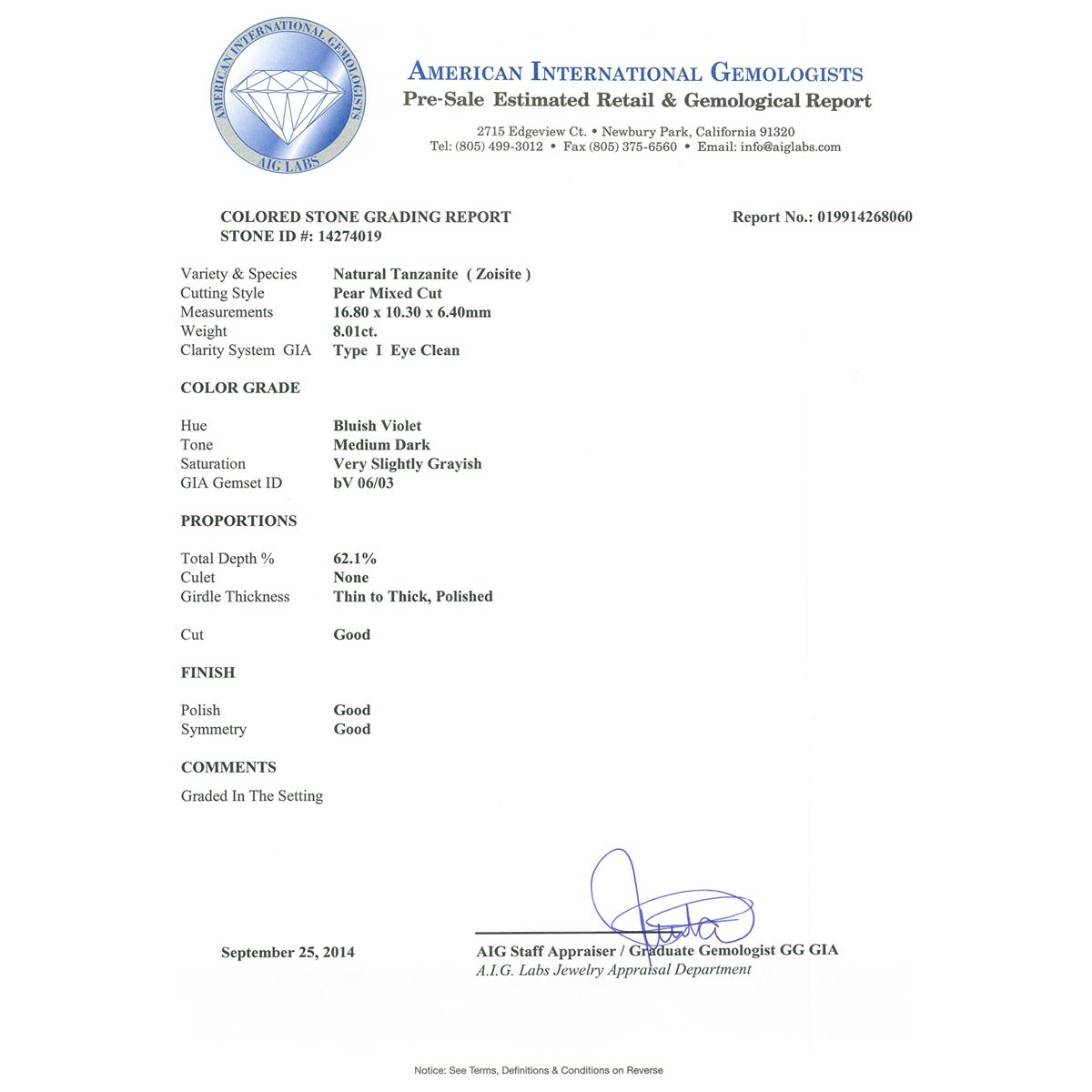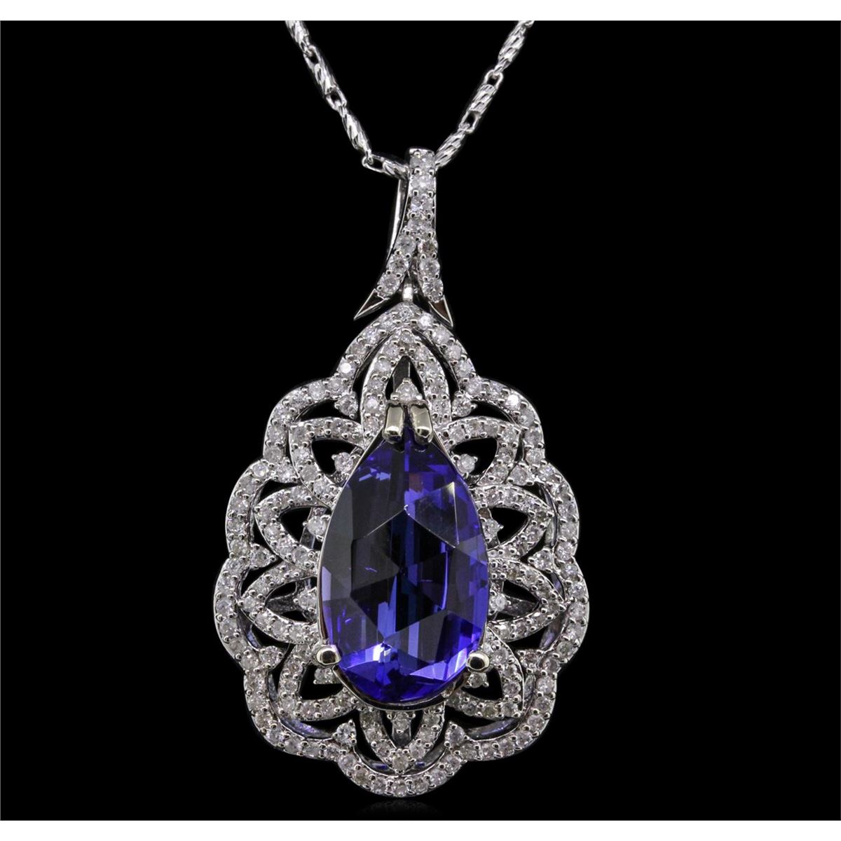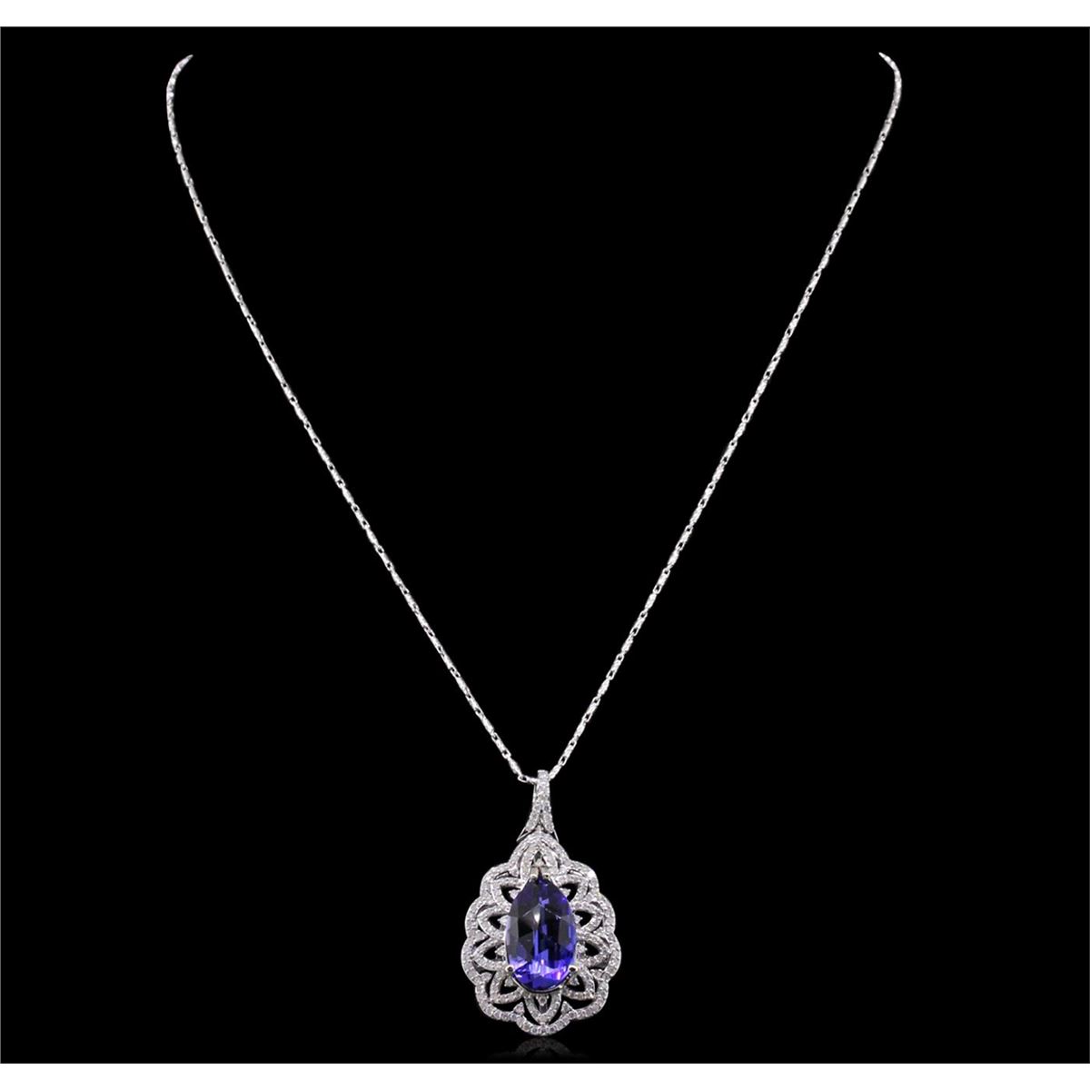 One electronically tested 14KT white gold ladies cast & assembled tanzanite and diamond pendant with chain. The pendant features a tanzanite set within a diamond lattice, completed by a diamond set bail. The pendant is supported by an eighteen inch length 14KT white gold designer style chain, terminating in a lobster claw clasp. Bright polish finish. Trademark is PMI. Identified with markings of "14K". Condition is new, good workmanship. Containing: One prong set pear mixed cut natural tanzanite, measuring 16.80 x 10.30 x 6.40mm, 8% bulge factor, approximate weight of 8.01ct., clarity is eye clean, type I, medium dark, very slightly grayish, bluish violet color, (GIA bV 6/3), cut is good. Transmitting light with no distortion, transparent. Colored Stone Grading Report attached. Graded in the setting. Tanzanite is a very rare gemstone that is only found in the country of Tanzania. Originally discovered in 1967. Tiffany & Company, named the stone Tanzanite. It is found in the Usumburu Mountains that border the Umba Valley of northern Tanzania. Tanzanite occurs in gray, brown, violet, blue, reddish-purple, & green. The gem is interesting because of its exceptional pleochroism. Rotated in different directions a tanzanite will exhibit multiple changes of color. Tanzanite has a low tolerance to ultrasonic cleaning, and should not be cleaned using this method. One Hundred Sixty-Two prong set round brilliant cut diamonds, measuring 1.20 - 1.10 x 0.69mm (depth est.) approximate total weight of 162 Stones = 1.00ct. Graded in the setting. Clarity: I-1 to I-2. Color: G - I. Total Weight of Colored Stones 8.01ct. Total Weight of Diamonds 1.00ct. Total Weight of Pendant With Chain 11.92 grams. AIG Appraised at $25,040.00.