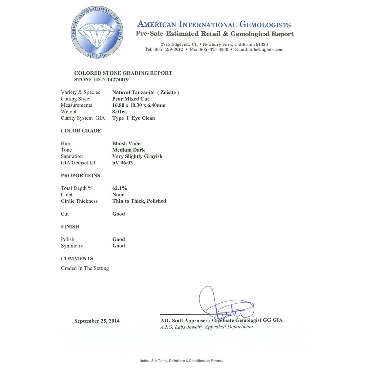 One electronically tested 14KT white gold ladies cast & assembled tanzanite and diamond pendant with chain. The pendant features a tanzanite set within a diamond lattice, completed by a diamond set bail. The pendant is supported by an eighteen inch length 14KT white gold designer style chain, terminating in a lobster claw clasp. Bright polish finish. Trademark is PMI. Identified with markings of "14K". Condition is new, good workmanship. Containing: One prong set pear mixed cut natural tanzanite, measuring 16.80 x 10.30 x 6.40mm, 8% bulge factor, approximate weight of 8.01ct., clarity is eye clean, type I, medium dark, very slightly grayish, bluish violet color, (GIA bV 6/3), cut is good. Transmitting light with no distortion, transparent. Colored Stone Grading Report attached. Graded in the setting. Tanzanite is a very rare gemstone that is only found in the country of Tanzania. Originally discovered in 1967. Tiffany & Company, named the stone Tanzanite. It is found in the Usumburu Mountains that border the Umba Valley of northern Tanzania. Tanzanite occurs in gray, brown, violet, blue, reddish-purple, & green. The gem is interesting because of its exceptional pleochroism. Rotated in different directions a tanzanite will exhibit multiple changes of color. Tanzanite has a low tolerance to ultrasonic cleaning, and should not be cleaned using this method. One Hundred Sixty-Two prong set round brilliant cut diamonds, measuring 1.20 - 1.10 x 0.69mm (depth est.) approximate total weight of 162 Stones = 1.00ct. Graded in the setting. Clarity: I-1 to I-2. Color: G - I. Total Weight of Colored Stones 8.01ct. Total Weight of Diamonds 1.00ct. Total Weight of Pendant With Chain 11.92 grams. AIG Appraised at $25,040.00.