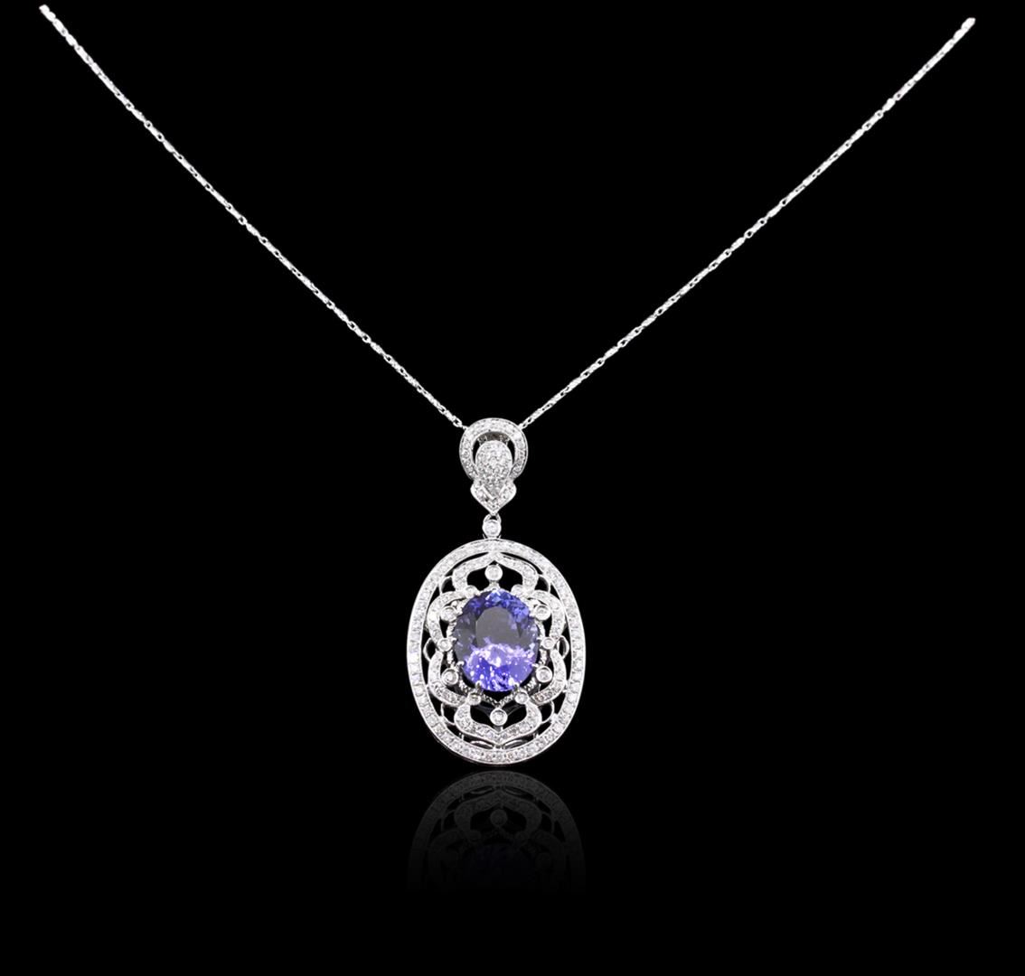 One electronically tested 14KT white gold ladies combination cast & assembled tanzanite and diamond pendant & chain 16.0" long, fancy link with a lobster claw clasp with a bright polish finish. Identified with markings of "585". Condition is new. Containing: One prong set oval modified brilliant cut natural tanzanite, measuring 14.20 x 11.10 x 7.22mm, approximate weight of 8.01ct., clarity is eye clean, type I, medium, moderately strong, bluish violet color, (GIA bV 5/4), cut is very good. One Hundred Fifty-Two prong set round brilliant cut diamonds, measuring 1.30 - 1.30 x 0.78mm (depth est.) approximate total weight of 152 Stones = 1.22ct. Clarity: I-1 to I-2. Color: H - I, Cut is Good. Colored gemstones are presumed to have been subjected to commonly used enhancement processes. All diamonds and colored gemstones are graded in the mounting, unless otherwise stated. Total Weight of Colored Stones 8.01ct. Total Weight of Diamonds 1.22ct. Total Weight of Pendant & Chain 13.10 grams. GGL Appraised at $13,905.00.