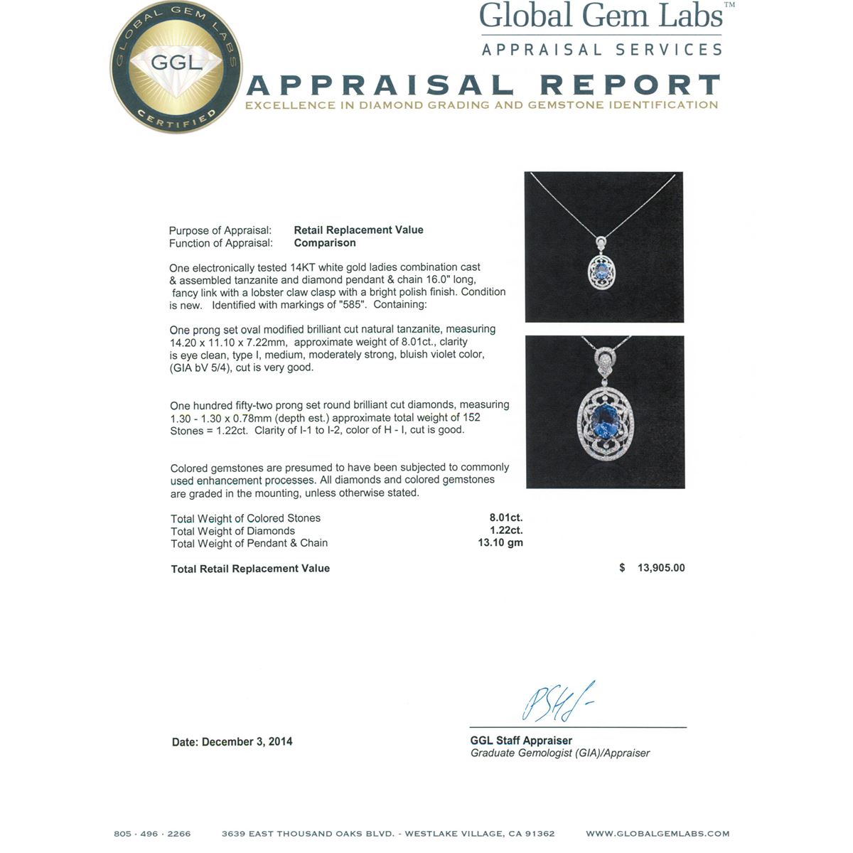 One electronically tested 14KT white gold ladies combination cast & assembled tanzanite and diamond pendant & chain 16.0" long, fancy link with a lobster claw clasp with a bright polish finish. Identified with markings of "585". Condition is new. Containing: One prong set oval modified brilliant cut natural tanzanite, measuring 14.20 x 11.10 x 7.22mm, approximate weight of 8.01ct., clarity is eye clean, type I, medium, moderately strong, bluish violet color, (GIA bV 5/4), cut is very good. One Hundred Fifty-Two prong set round brilliant cut diamonds, measuring 1.30 - 1.30 x 0.78mm (depth est.) approximate total weight of 152 Stones = 1.22ct. Clarity: I-1 to I-2. Color: H - I, Cut is Good. Colored gemstones are presumed to have been subjected to commonly used enhancement processes. All diamonds and colored gemstones are graded in the mounting, unless otherwise stated. Total Weight of Colored Stones 8.01ct. Total Weight of Diamonds 1.22ct. Total Weight of Pendant & Chain 13.10 grams. GGL Appraised at $13,905.00.