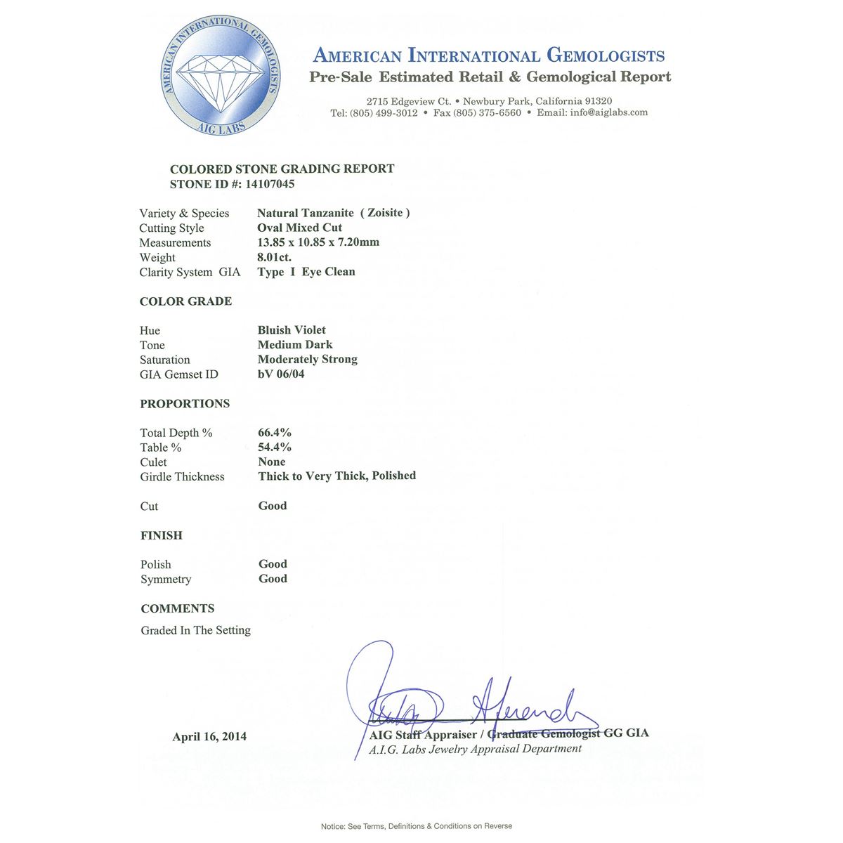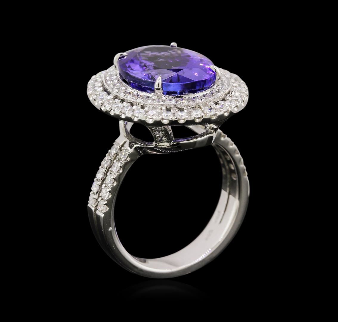 One electronically tested 14KT white gold ladies cast tanzanite and diamond ring. Condition is new, good workmanship. The featured tanzanite is set within a two tiered diamond lattice gallery, supported by diamond set split shoulders and completed by a four millimeter wide band. Bright polish finish with milgrain detailing throughout. Trademark is UCG. Identified with markings of "14K 585". Containing: One prong set oval mixed cut natural tanzanite, measuring 13.85 x 10.85 x 7.20mm, 8%. bulge factor, approximate weight of 8.01ct., clarity is eye clean, type I, medium dark, moderately strong, bluish violet color, (GIA bV 6/4), cut is good. Transmitting light with no distortion, transparent. Colored Stone Grading Report attached. Graded in the setting. Tanzanite is a very rare gemstone that is only found in the country of Tanzania. Originally discovered in 1967. Tiffany & Company, named the stone Tanzanite. It is found in the Usumburu Mountains that border the Umba Valley of northern Tanzania. Tanzanite occurs in gray, brown, violet, blue, reddish-purple, & green. The gem is interesting because of its exceptional pleochroism. Rotated in different directions a tanzanite will exhibit multiple changes of color. Tanzanite has a low tolerance to ultrasonic cleaning, and should not be cleaned using this method. Forty-Four prong set round brilliant cut diamonds, measuring 1.40 - 1.30 x 0.81mm (depth est.) approximate. Total Weight of 44 Stones = 0.49ct. Graded in the setting. Clarity: SI-2 to I-2. Color: F - H Fifty-Four prong set round brilliant cut diamonds, measuring 1.60 - 1.50 x 0.93mm (depth est.) approximate. Total Weight of 54 Stones = 0.83ct. Graded in the setting. Clarity: SI-2 to I-2. Color: F - H. Total Weight of Colored Stones 8.01ct. Total Weight of Diamonds 1.32ct. Total Weight of Ring 8.70 grams. AIG Appraised at $25,525.00.