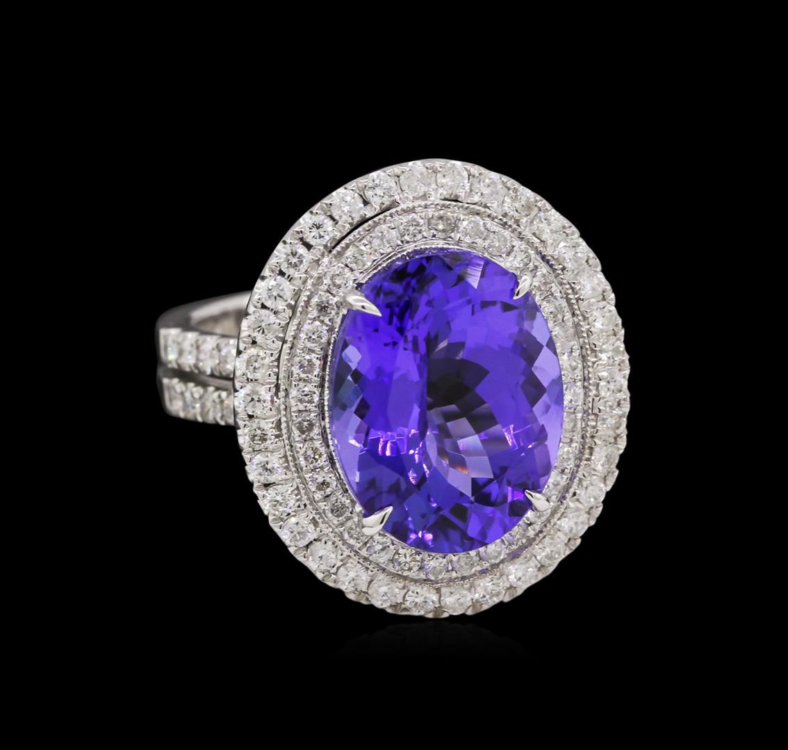 One electronically tested 14KT white gold ladies cast tanzanite and diamond ring. Condition is new, good workmanship. The featured tanzanite is set within a two tiered diamond lattice gallery, supported by diamond set split shoulders and completed by a four millimeter wide band. Bright polish finish with milgrain detailing throughout. Trademark is UCG. Identified with markings of "14K 585". Containing: One prong set oval mixed cut natural tanzanite, measuring 13.85 x 10.85 x 7.20mm, 8%. bulge factor, approximate weight of 8.01ct., clarity is eye clean, type I, medium dark, moderately strong, bluish violet color, (GIA bV 6/4), cut is good. Transmitting light with no distortion, transparent. Colored Stone Grading Report attached. Graded in the setting. Tanzanite is a very rare gemstone that is only found in the country of Tanzania. Originally discovered in 1967. Tiffany & Company, named the stone Tanzanite. It is found in the Usumburu Mountains that border the Umba Valley of northern Tanzania. Tanzanite occurs in gray, brown, violet, blue, reddish-purple, & green. The gem is interesting because of its exceptional pleochroism. Rotated in different directions a tanzanite will exhibit multiple changes of color. Tanzanite has a low tolerance to ultrasonic cleaning, and should not be cleaned using this method. Forty-Four prong set round brilliant cut diamonds, measuring 1.40 - 1.30 x 0.81mm (depth est.) approximate. Total Weight of 44 Stones = 0.49ct. Graded in the setting. Clarity: SI-2 to I-2. Color: F - H Fifty-Four prong set round brilliant cut diamonds, measuring 1.60 - 1.50 x 0.93mm (depth est.) approximate. Total Weight of 54 Stones = 0.83ct. Graded in the setting. Clarity: SI-2 to I-2. Color: F - H. Total Weight of Colored Stones 8.01ct. Total Weight of Diamonds 1.32ct. Total Weight of Ring 8.70 grams. AIG Appraised at $25,525.00.