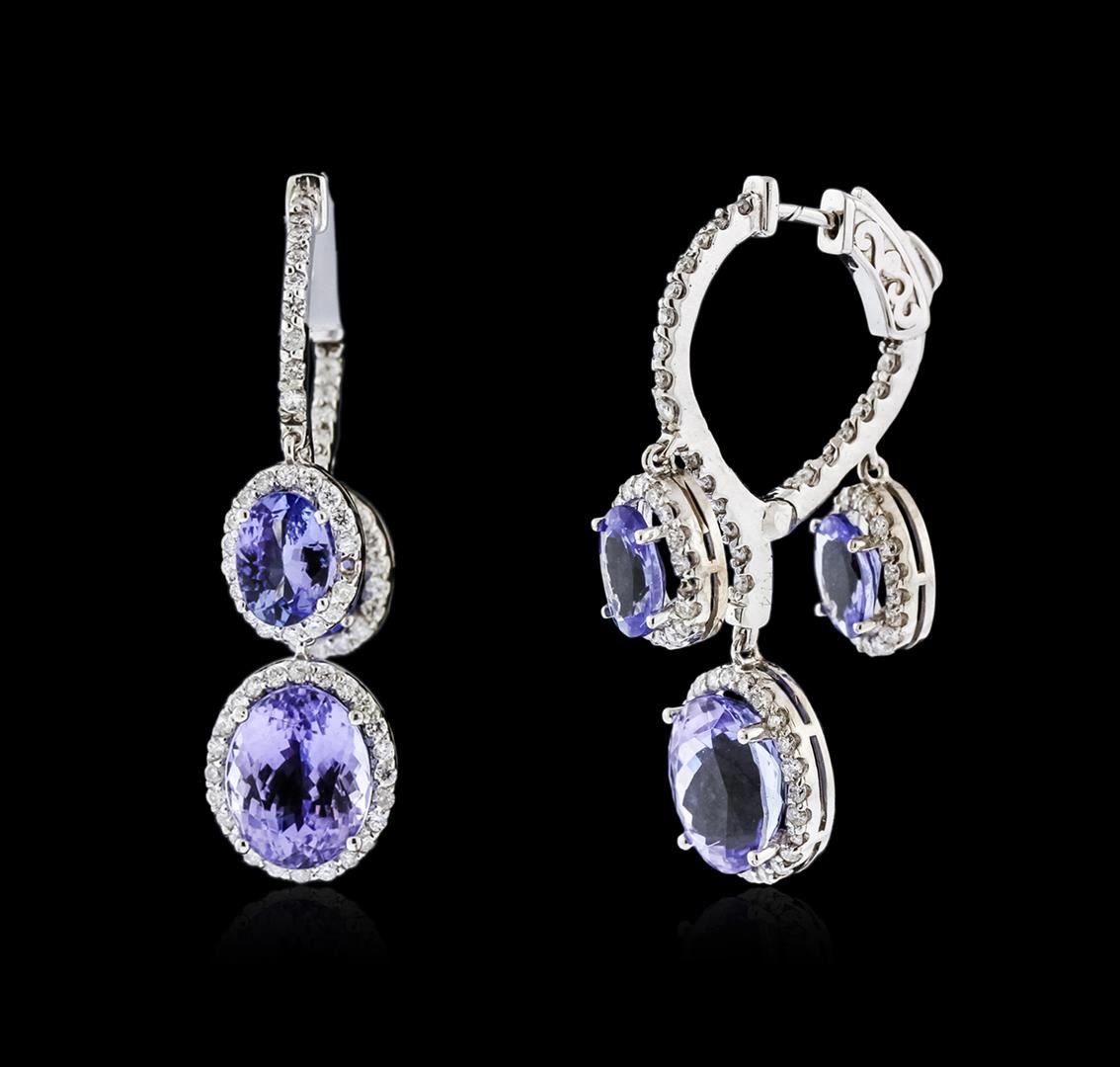 One pair electronically tested 14KT white gold ladies cast tanzanite and diamond earrings with hinged clip backs with a bright polish finish. Identified with markings of "14K". Condition is new. Containing: Two prong set oval modified brilliant cut natural tanzanites, measuring 9.50 x 7.50 x 4.88mm, approximate total weight of 4.90ct., clarity is eye clean, type I, light, very slightly grayish, violet color, (GIA V 3/3), cut is good. Four prong set oval modified brilliant cut natural tanzanites, measuring 7.00 x 5.00 x 3.25mm, approximate total weight of 3.20ct., clarity is eye clean, type I, medium light, very slightly grayish, violet color, (GIA V 4/3), cut is good. One Hundred Forty-Four prong set round brilliant cut diamonds, measuring 1.20 - 1.20 x 0.72mm (depth est.) approximate total weight of 144 Stones = 0.91ct. Clarity: SI-2 to I-1. Color: I - J, Cut is Good. Colored gemstones are presumed to have been subjected to commonly used enhancement processes. All diamonds and colored gemstones are graded in the mounting, unless otherwise stated. Total Weight of Colored Stones 8.10ct. Total Weight of Diamonds 0.91ct. Total Weight of Earrings 8.50 grams. GGL Appraised at $6,475.00.