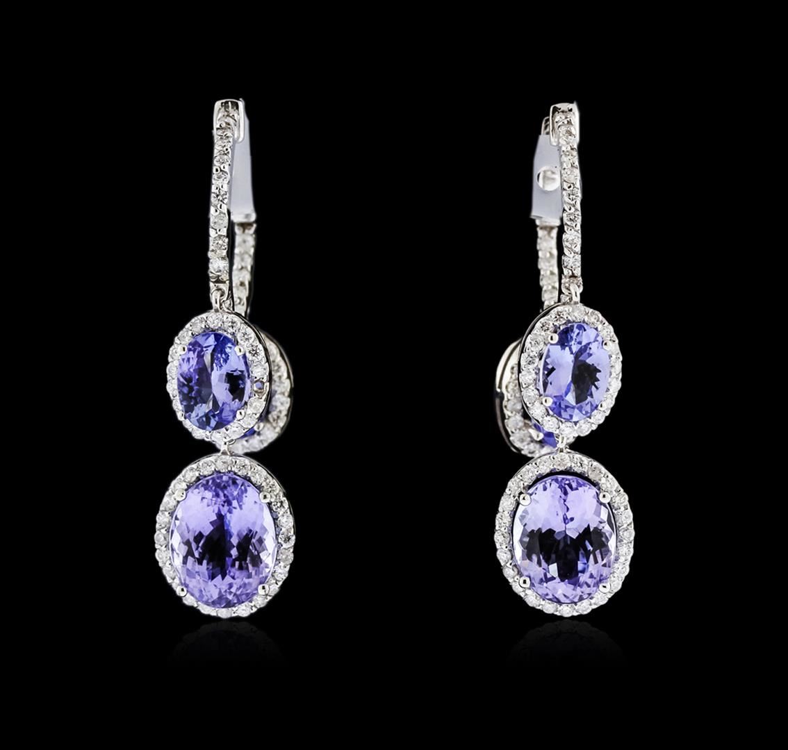 One pair electronically tested 14KT white gold ladies cast tanzanite and diamond earrings with hinged clip backs with a bright polish finish. Identified with markings of "14K". Condition is new. Containing: Two prong set oval modified brilliant cut natural tanzanites, measuring 9.50 x 7.50 x 4.88mm, approximate total weight of 4.90ct., clarity is eye clean, type I, light, very slightly grayish, violet color, (GIA V 3/3), cut is good. Four prong set oval modified brilliant cut natural tanzanites, measuring 7.00 x 5.00 x 3.25mm, approximate total weight of 3.20ct., clarity is eye clean, type I, medium light, very slightly grayish, violet color, (GIA V 4/3), cut is good. One Hundred Forty-Four prong set round brilliant cut diamonds, measuring 1.20 - 1.20 x 0.72mm (depth est.) approximate total weight of 144 Stones = 0.91ct. Clarity: SI-2 to I-1. Color: I - J, Cut is Good. Colored gemstones are presumed to have been subjected to commonly used enhancement processes. All diamonds and colored gemstones are graded in the mounting, unless otherwise stated. Total Weight of Colored Stones 8.10ct. Total Weight of Diamonds 0.91ct. Total Weight of Earrings 8.50 grams. GGL Appraised at $6,475.00.