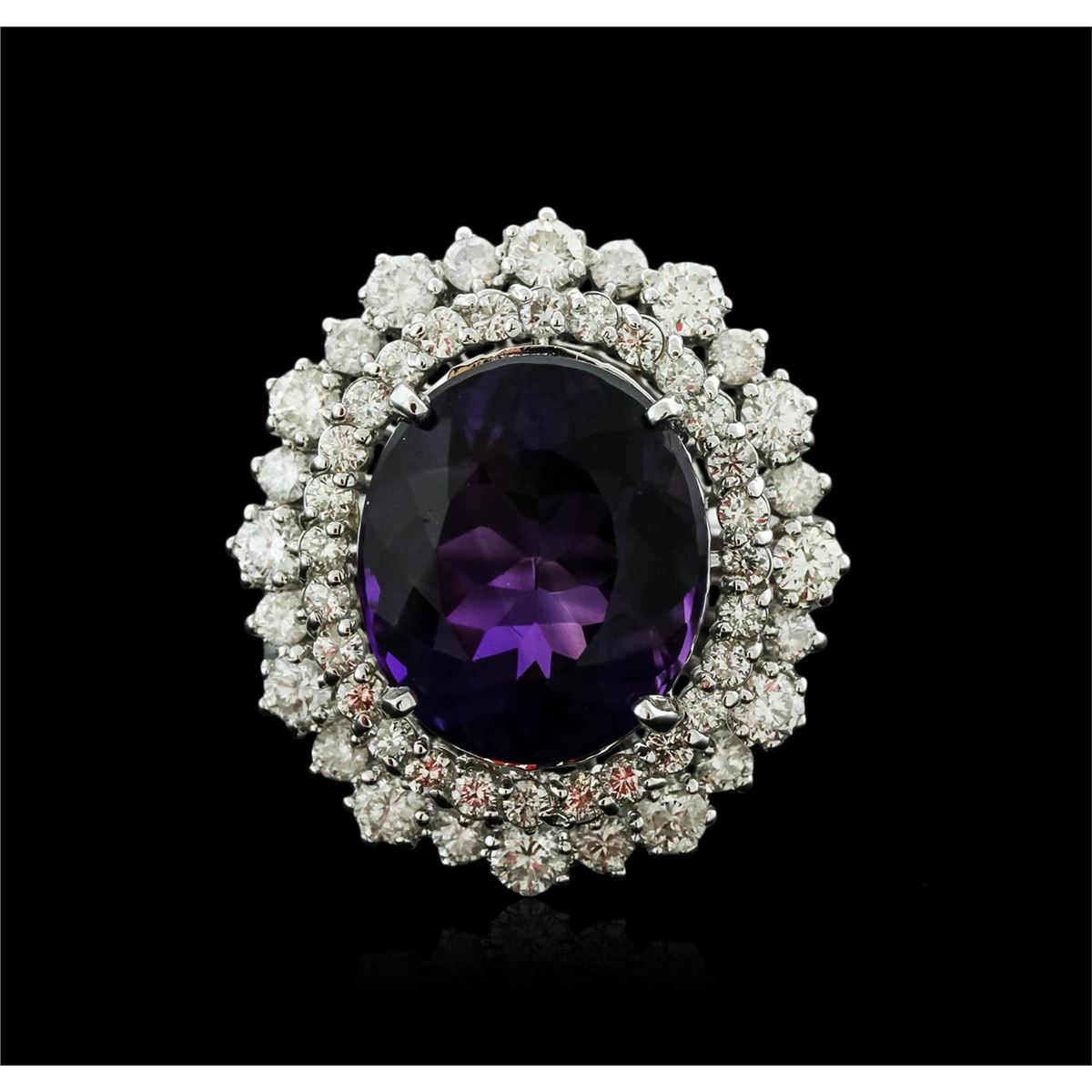 One electronically tested 14KT white gold ladies cast amethyst and diamond ring with a bright polish finish. Identified with markings of "K14". Condition is new. Containing: One prong set oval modified brilliant cut natural amethyst, measuring 14.00 x 12.00 x 8.64mm, approximate weight of 8.11ct., clarity is eye clean, type II, medium, moderately strong, purple color, (GIA P 5/4), cut is good. Fifty-Two prong set round brilliant cut diamonds, measuring 2.50 - 1.50 x 1.20mm (depth est.) approximate total weight of 52 Stones = 1.52ct. Clarity: SI-1 to SI-2. Color: I - J, Cut is Good. Colored gemstones are presumed to have been subjected to commonly used enhancement processes. All diamonds and colored gemstones are graded in the mounting, unless otherwise stated. Total Weight of Colored Stones 8.11ct. Total Weight of Diamonds 1.52ct. Total Weight of Ring 8.60 grams. GGL Appraised at $4,610.00.