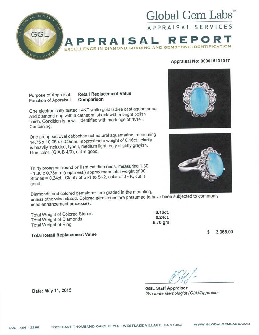 One electronically tested 14KT white gold ladies cast aquamarine and diamond ring with a cathedral shank with a bright polish finish. Identified with markings of "K14". Condition is new. Containing: One prong set oval cabochon cut natural aquamarine, measuring 14.75 x 10.05 x 6.53mm, approximate weight of 8.16ct., clarity is heavily included, type I, medium light, very slightly grayish, blue color, (GIA B 4/3), cut is good. Thirty prong set round brilliant cut diamonds, measuring 1.30 - 1.30 x 0.78mm (depth est.) approximate total weight of 30 Stones = 0.24ct. Clarity: SI-1 to SI-2. Color: J - K, Cut is Good. Diamonds and colored gemstones are graded in the mounting, unless otherwise stated. Colored gemstones are presumed to have been subjected to commonly used enhancement processes. Total Weight of Colored Stones 8.16ct. Total Weight of Diamonds 0.24ct. Total Weight of Ring 6.70 grams. GGL Appraised at $3,365.00.