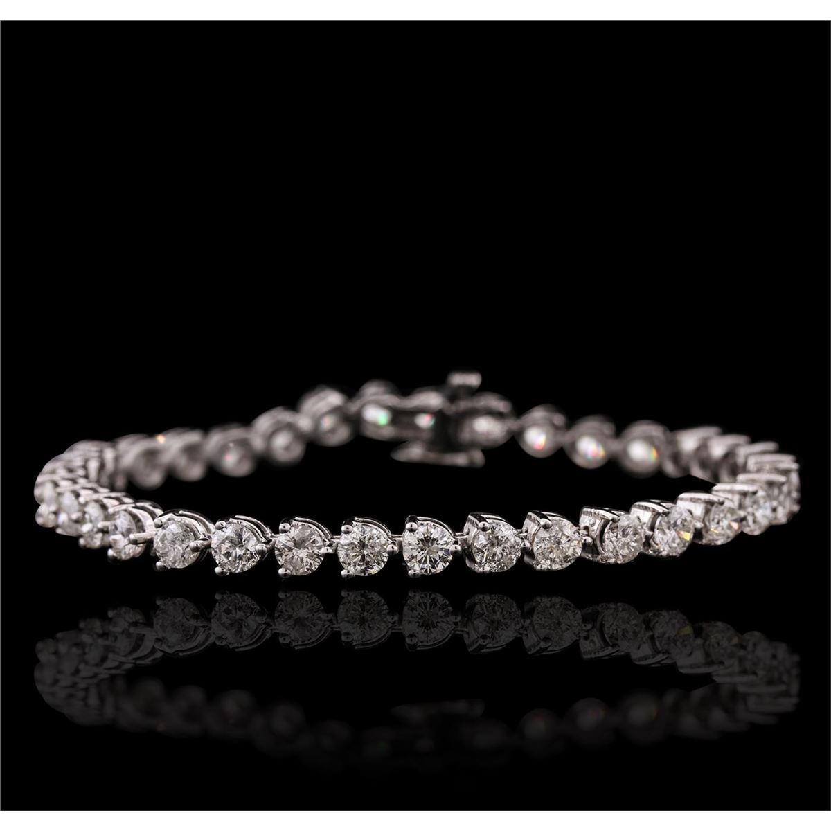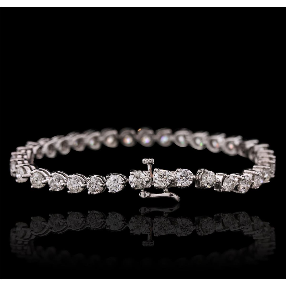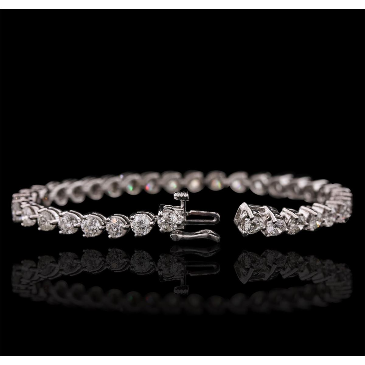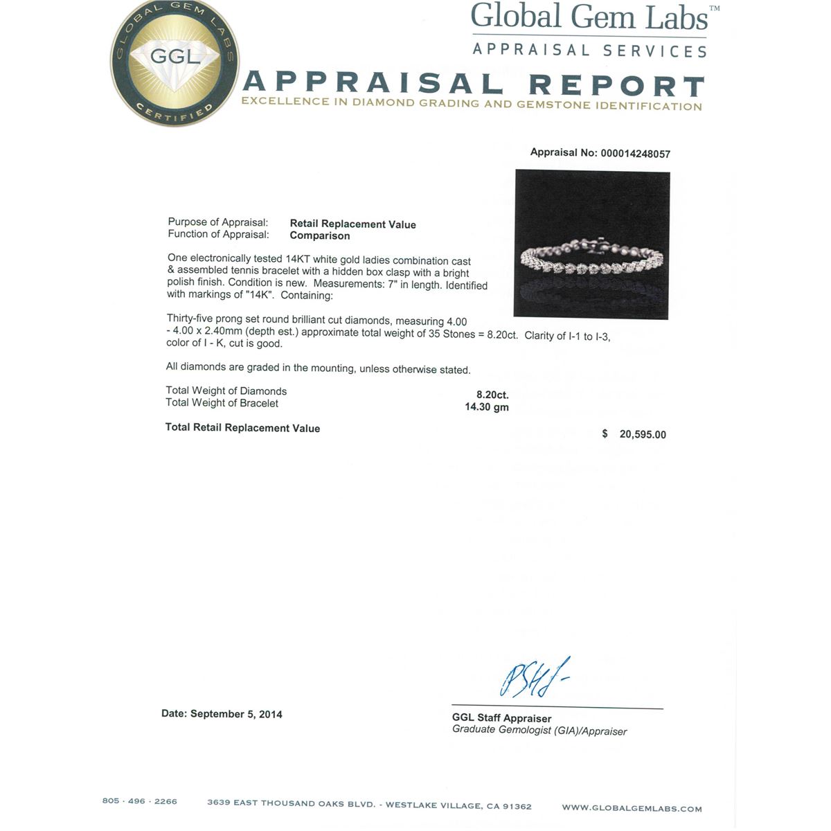 One electronically tested 14KT white gold ladies combination cast & assembled tennis bracelet with a hidden box clasp with a bright polish finish. Measurements: 7" in length. Identified with markings of "14K". Condition is new. Containing: Thirty-Five prong set round brilliant cut diamonds, measuring 4.00 - 4.00 x 2.40mm (depth est.) approximate total weight of 35 Stones = 8.20ct. Clarity: I-1 to I-3. Color: I - K, Cut is Good. All diamonds are graded in the mounting, unless otherwise stated. Total Weight of Diamonds 8.20ct. Total Weight of Bracelet 14.30 grams. GGL Appraised at $20,595.00.
