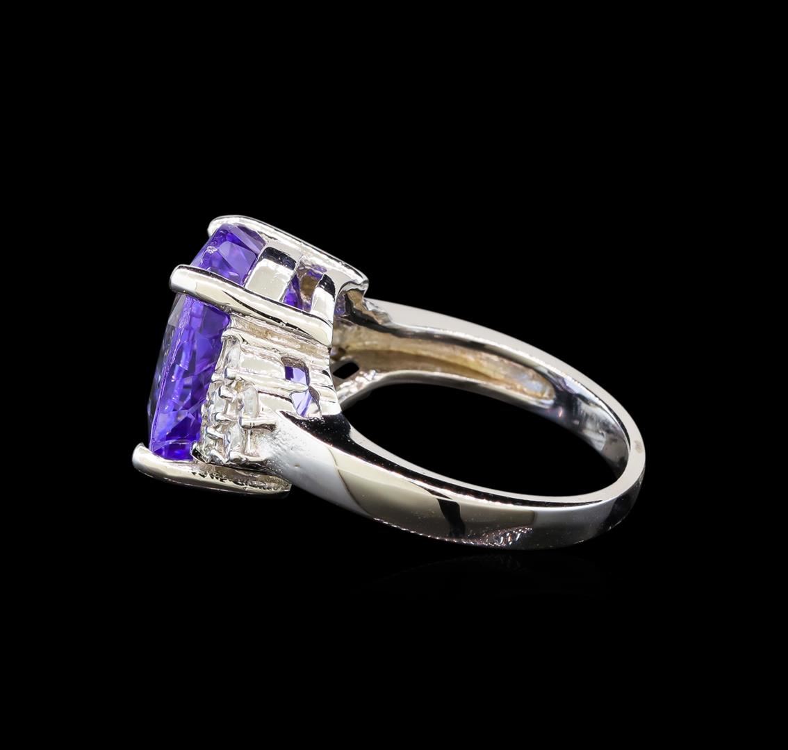 One electronically tested 14KT white gold ladies cast tanzanite and diamond ring with a bright polish finish. Identified with markings of "K14". Condition is new. Containing: One prong set oval modified brilliant cut natural tanzanite, measuring 13.50 x 11.00. x 7.90mm, approximate weight of 8.25ct., clarity is eye clean, type I, medium light, very slightly grayish, violet color, (GIA V 4/3), cut is good. Ten prong set round brilliant cut diamonds, measuring 2.00. - 2.00. x 1.20mm (depth est.) approximate total weight of 10 Stones = 0.29ct. Clarity: SI-1. Color: I - J, Cut is Good. Colored gemstones are presumed to have been subjected to commonly used enhancement processes. All diamonds and colored gemstones are graded in the mounting, unless otherwise stated. Total Weight of Colored Stones 8.25ct. Total Weight of Diamonds 0.29ct. Total Weight of Ring 7.30 grams. GGL Appraised at $5,775.00.