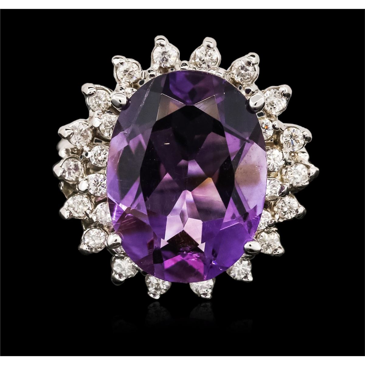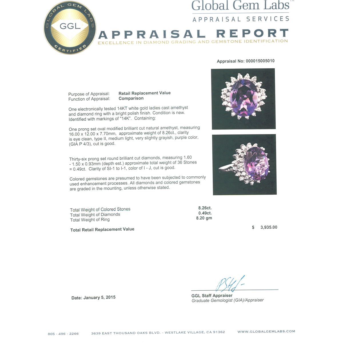 One electronically tested 14KT white gold ladies cast amethyst and diamond ring with a bright polish finish. Identified with markings of "14K". Condition is new. Containing: One prong set oval modified brilliant cut natural amethyst, measuring 16.00 x 12.00 x 7.70mm, approximate weight of 8.26ct., clarity is eye clean, type II, medium light, very slightly grayish, purple color, (GIA P 4/3), cut is good. Thirty-Six prong set round brilliant cut diamonds, measuring 1.60 - 1.50 x 0.93mm (depth est.) approximate total weight of 36 Stones = 0.49ct. Clarity: SI-1 to I-1. Color: I - J, Cut is Good. Colored gemstones are presumed to have been subjected to commonly used enhancement processes. All diamonds and colored gemstones are graded in the mounting, unless otherwise stated. Total Weight of Colored Stones 8.26ct. Total Weight of Diamonds 0.49ct. Total Weight of Ring 8.20 grams. GGL Appraised at $3,935.00.