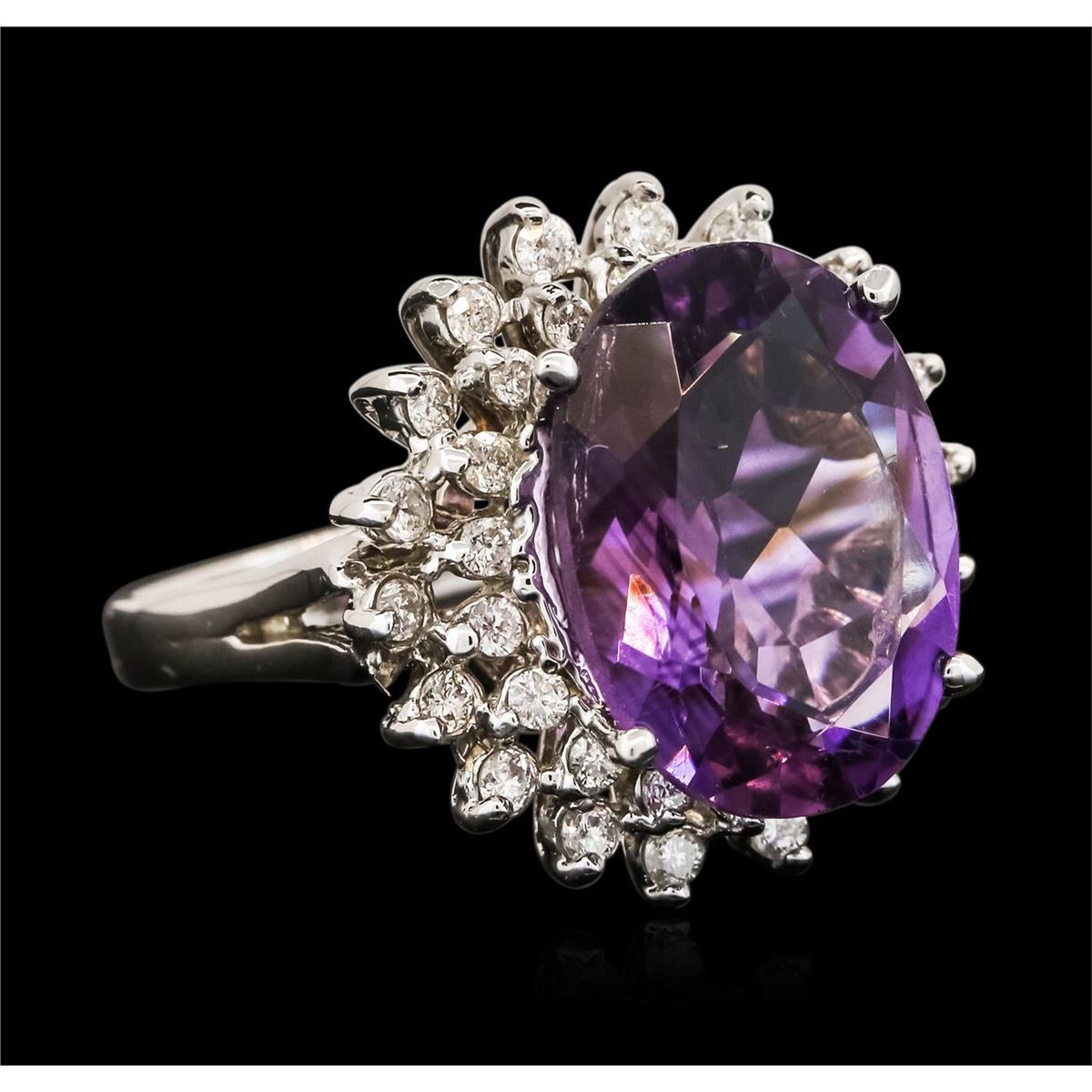 One electronically tested 14KT white gold ladies cast amethyst and diamond ring with a bright polish finish. Identified with markings of "14K". Condition is new. Containing: One prong set oval modified brilliant cut natural amethyst, measuring 16.00 x 12.00 x 7.70mm, approximate weight of 8.26ct., clarity is eye clean, type II, medium light, very slightly grayish, purple color, (GIA P 4/3), cut is good. Thirty-Six prong set round brilliant cut diamonds, measuring 1.60 - 1.50 x 0.93mm (depth est.) approximate total weight of 36 Stones = 0.49ct. Clarity: SI-1 to I-1. Color: I - J, Cut is Good. Colored gemstones are presumed to have been subjected to commonly used enhancement processes. All diamonds and colored gemstones are graded in the mounting, unless otherwise stated. Total Weight of Colored Stones 8.26ct. Total Weight of Diamonds 0.49ct. Total Weight of Ring 8.20 grams. GGL Appraised at $3,935.00.