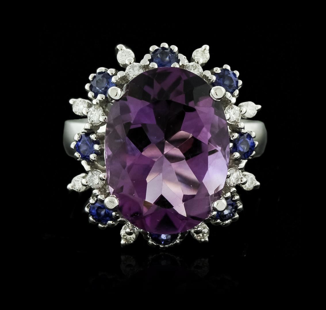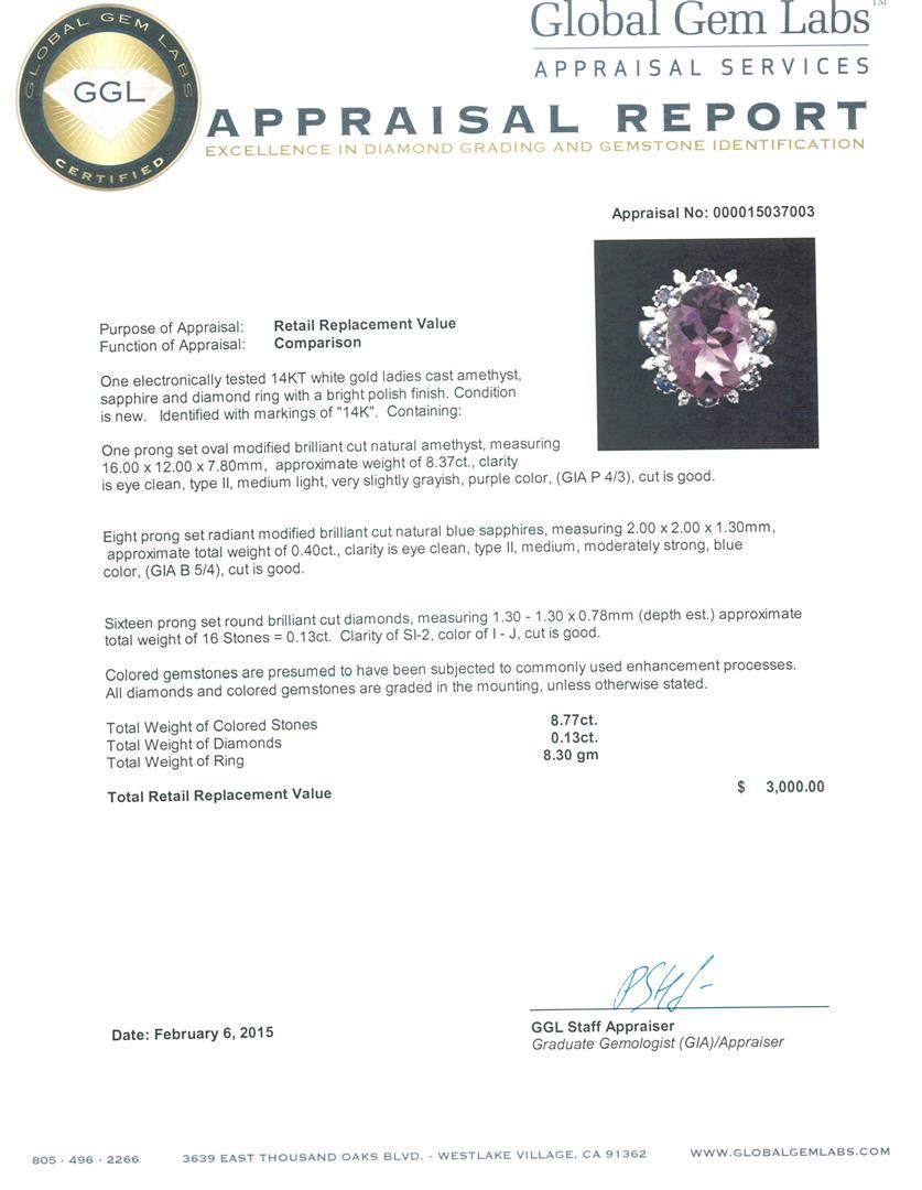 One electronically tested 14KT white gold ladies cast amethyst, sapphire and diamond ring with a bright polish finish. Identified with markings of "14K". Condition is new. Containing: One prong set oval modified brilliant cut natural amethyst, measuring 16.00 x 12.00 x 7.80mm, approximate weight of 8.37ct., clarity is eye clean, type II, medium light, very slightly grayish, purple color, (GIA P 4/3), cut is good. Eight prong set radiant modified brilliant cut natural blue sapphires, measuring 2.00 x 2.00 x 1.30mm, approximate total weight of 0.40ct., clarity is eye clean, type II, medium, moderately strong, blue color, (GIA B 5/4), cut is good. Sixteen prong set round brilliant cut diamonds, measuring 1.30 - 1.30 x 0.78mm (depth est.) approximate total weight of 16 Stones = 0.13ct. Clarity: SI-2. Color: I - J, Cut is Good. Colored gemstones are presumed to have been subjected to commonly used enhancement processes. All diamonds and colored gemstones are graded in the mounting, unless otherwise stated. Total Weight of Colored Stones 8.77ct. Total Weight of Diamonds 0.13ct. Total Weight of Ring 8.30 grams. GGL Appraised at $3,000.00.