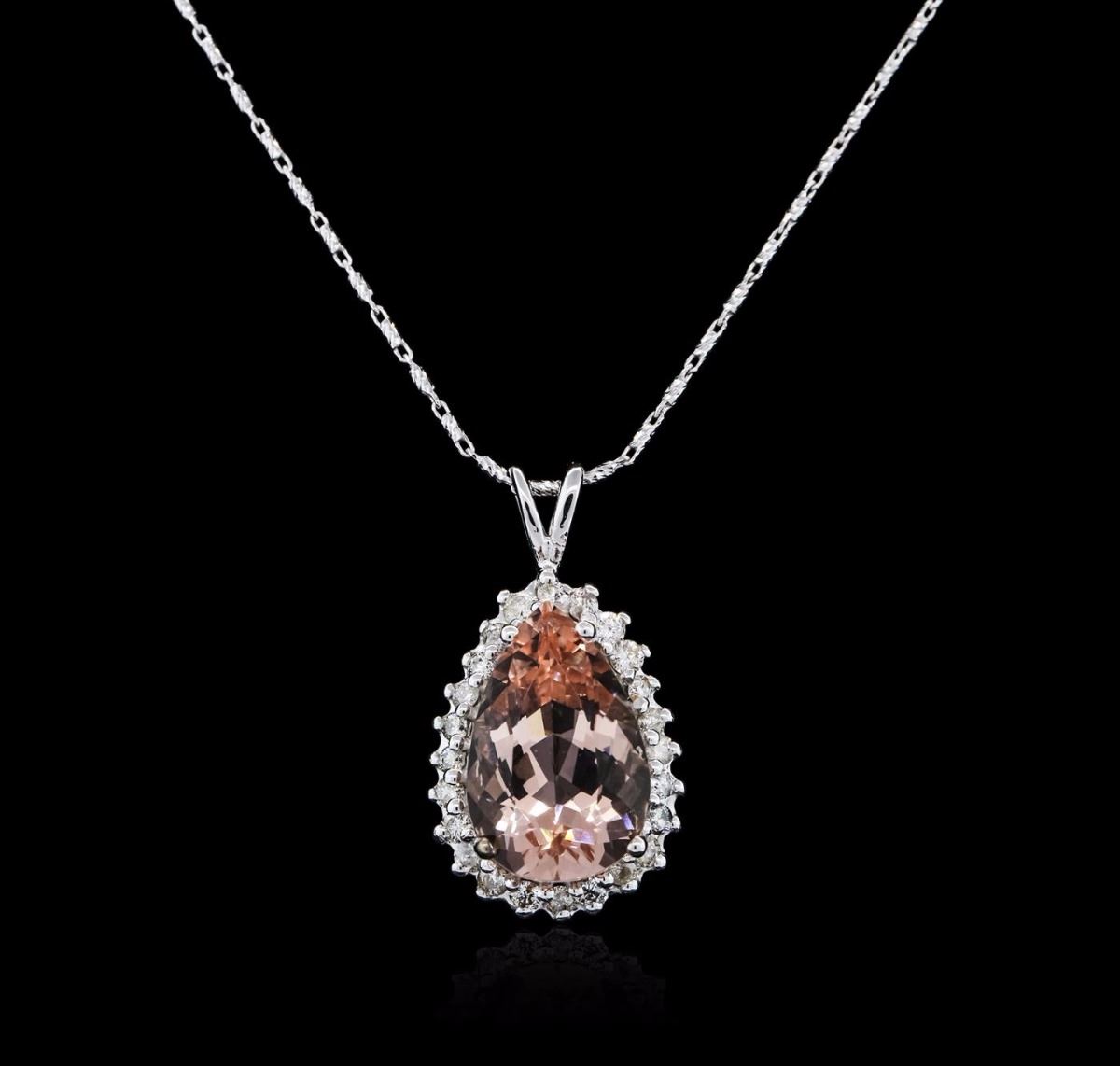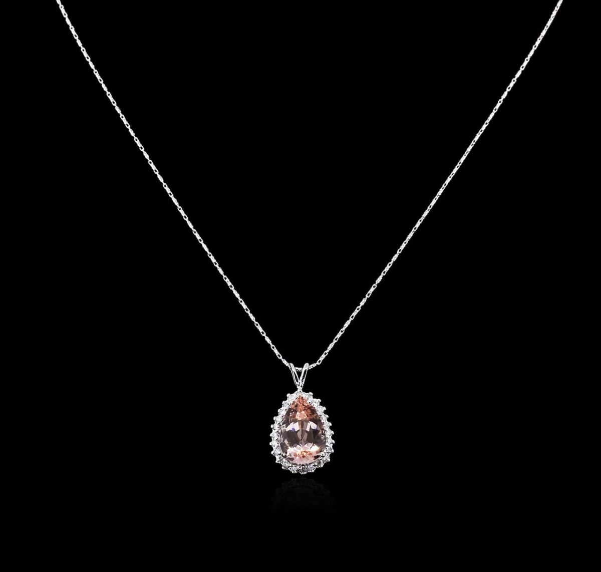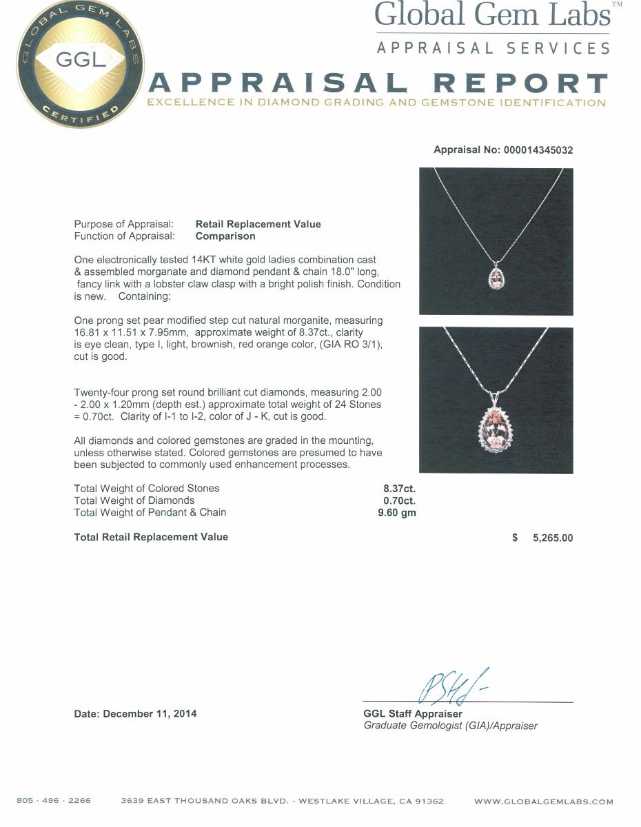 One electronically tested 14KT white gold ladies combination cast & assembled morganite and diamond pendant & chain 18.0" long, fancy link with a lobster claw clasp with a bright polish finish. Condition is new. Containing: One prong set pear modified step cut natural morganatic, measuring 16.81 x 11.51 x 7.95mm, approximate weight of 8.37ct., clarity is eye clean, type I, light, brownish, red orange color, (GIA RO 3/1), cut is good. Twenty-Four prong set round brilliant cut diamonds, measuring 2.00 - 2.00 x 1.20mm (depth est.) approximate total weight of 24 Stones = 0.70ct. Clarity: I-1 to I-2. Color: J - K, Cut is Good. All diamonds and colored gemstones are graded in the mounting, unless otherwise stated. Colored gemstones are presumed to have been subjected to commonly used enhancement processes. Total Weight of Colored Stones 8.37ct. Total Weight of Diamonds 0.70ct. Total Weight of Pendant & Chain 9.60 grams. GGL Appraised at $5,265.00.