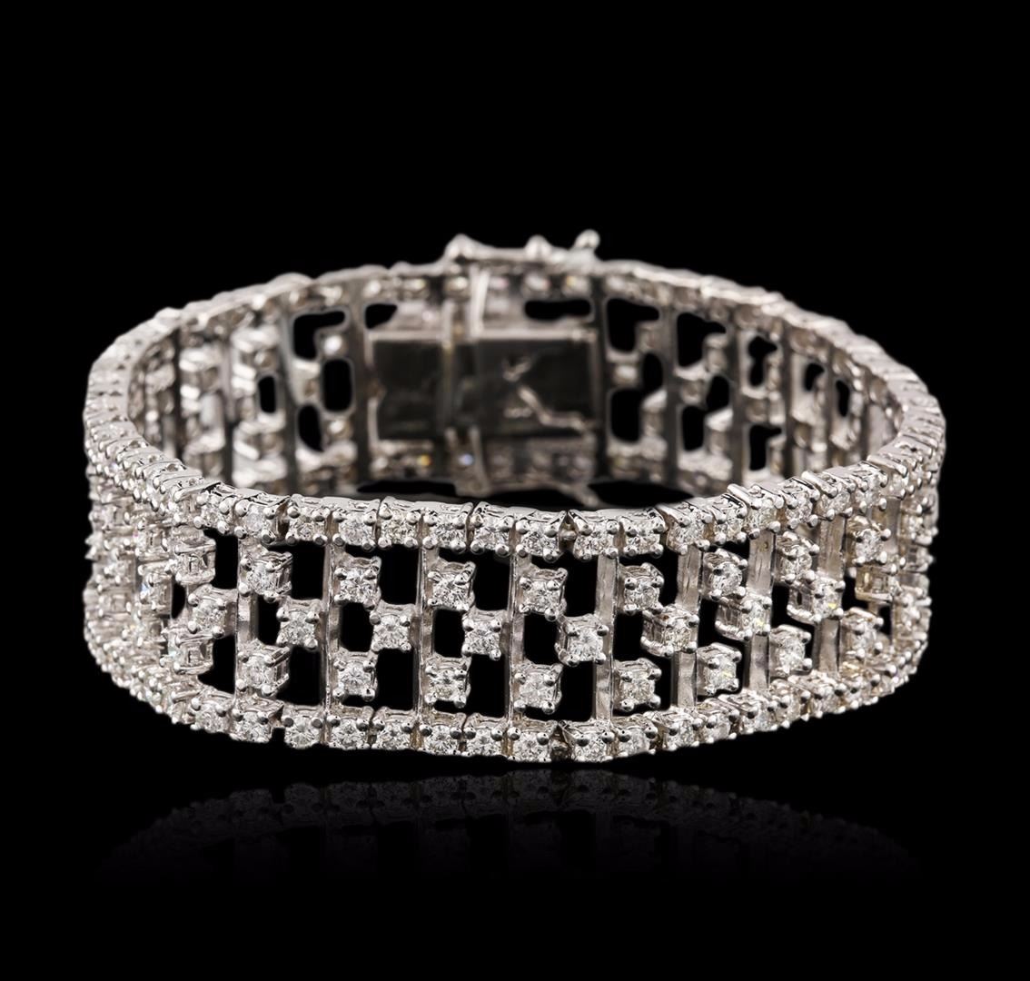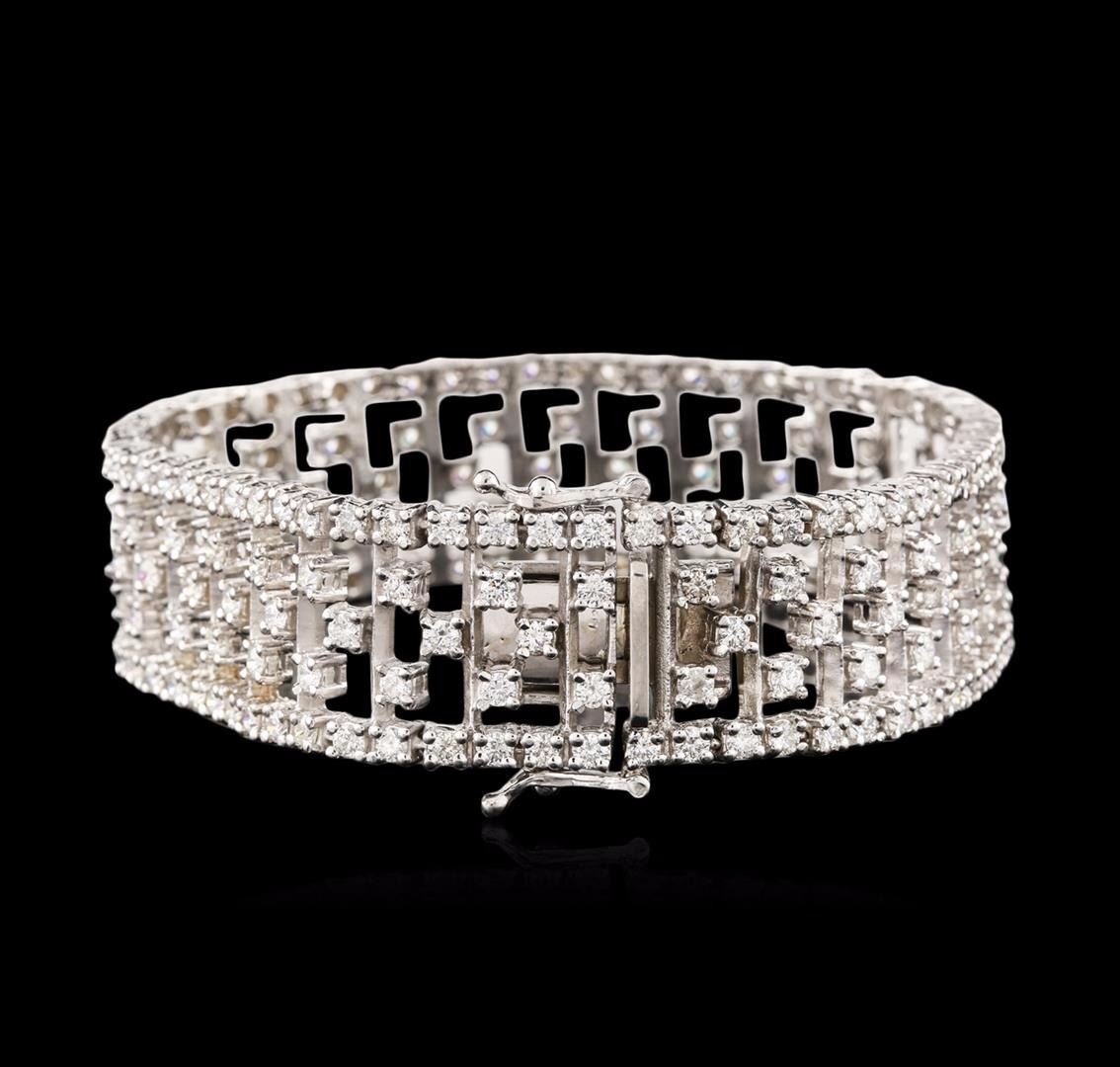 One electronically tested 14KT white gold ladies cast & assembled diamond bracelet with a bright polish finish. Seven inch length bracelet features a flexible six-eighths of an inch wide stylized diamond lattice ribbon, terminating in a concealed clasp with twin safeties. Identified with markings of "14K". Condition is new, good workmanship. Containing: Two Hundred Two prong set round brilliant cut diamonds, measuring 2.30 - 2.20 x 1.35mm (depth est.) approximate total weight of 202 Stones = 8.40ct. Graded in the setting. Clarity: VS-2 to SI-1. Color: G - I. Total Weight of Diamonds 8.40ct. Total Weight of Bracelet 40.30 grams. AIG Appraised at $33,870.00.