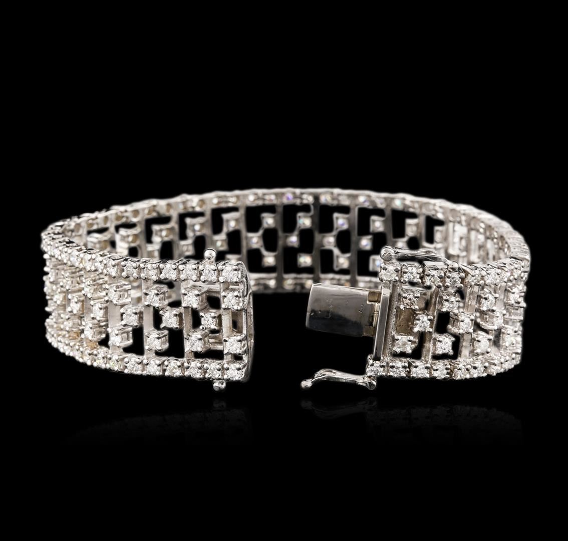 One electronically tested 14KT white gold ladies cast & assembled diamond bracelet with a bright polish finish. Seven inch length bracelet features a flexible six-eighths of an inch wide stylized diamond lattice ribbon, terminating in a concealed clasp with twin safeties. Identified with markings of "14K". Condition is new, good workmanship. Containing: Two Hundred Two prong set round brilliant cut diamonds, measuring 2.30 - 2.20 x 1.35mm (depth est.) approximate total weight of 202 Stones = 8.40ct. Graded in the setting. Clarity: VS-2 to SI-1. Color: G - I. Total Weight of Diamonds 8.40ct. Total Weight of Bracelet 40.30 grams. AIG Appraised at $33,870.00.