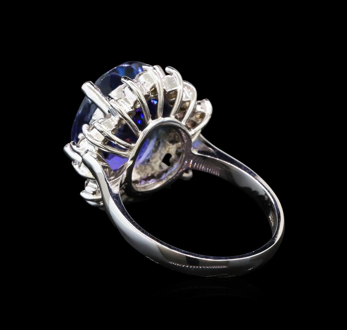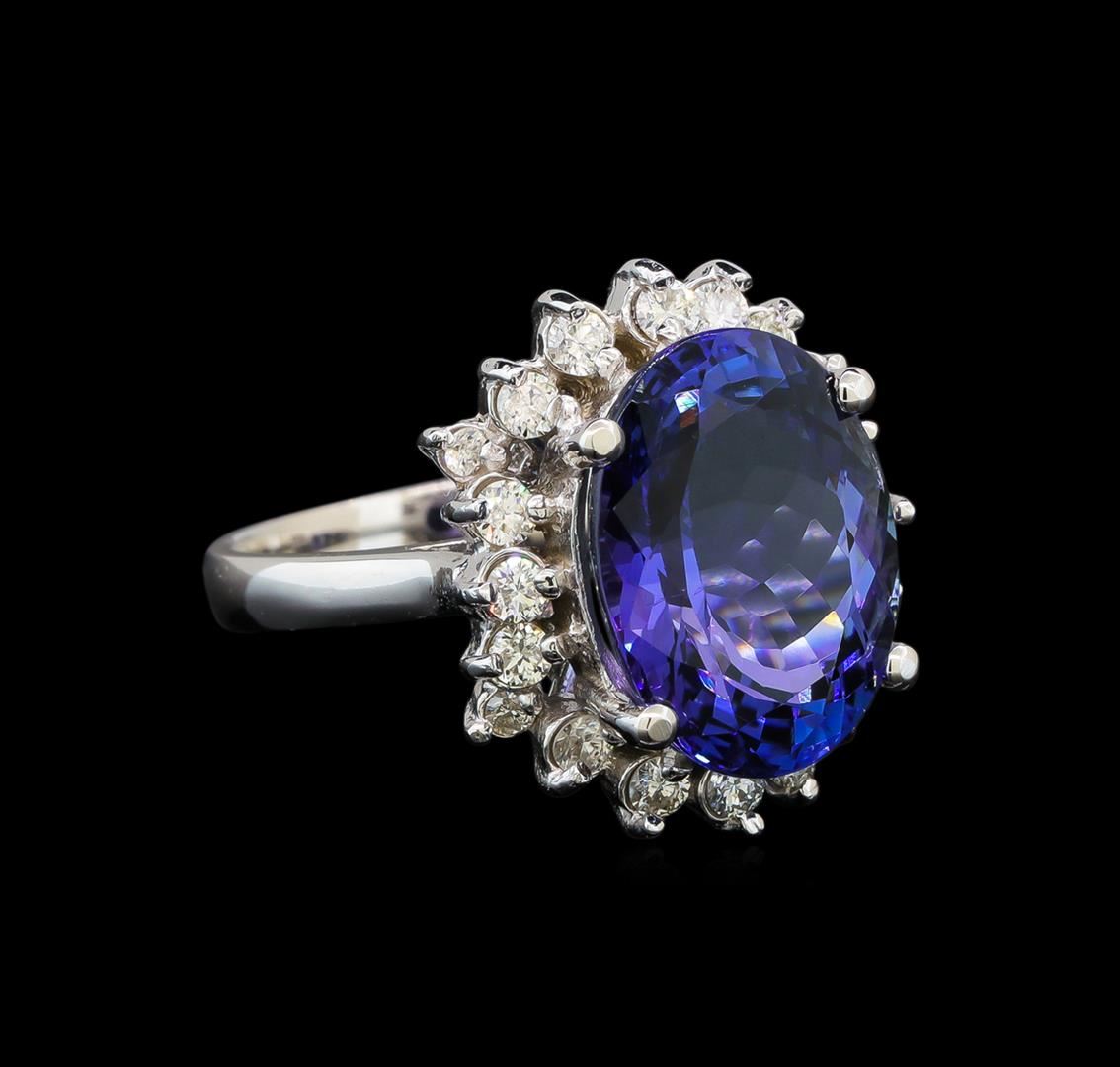 One electronically tested 14KT white gold ladies cast tanzanite and diamond ring with a bright polish finish. Identified with markings of "K14". Condition is new. Containing: One prong set oval modified brilliant cut natural tanzanite, measuring 14.00 x 10.61 x 8.08mm, approximate weight of 8.44ct., clarity is eye clean, type I, medium light, slightly grayish, violet color, (GIA V 4/2), cut is good. Twenty prong set round brilliant cut diamonds, measuring 2.00 - 1.50 x 1.05mm (depth est.) approximate. Total Weight of 20 Stones = 0.39ct. Clarity: SI-1. Color: I - J, Cut is Good. Colored gemstones are presumed to have been subjected to commonly used enhancement processes. All diamonds and colored gemstones are graded in the mounting, unless otherwise stated. Total Weight of Colored Stones 8.44ct. Total Weight of Diamonds 0.39ct. Total Weight of Ring 7.30 grams. GGL Appraised at $5,595.00.