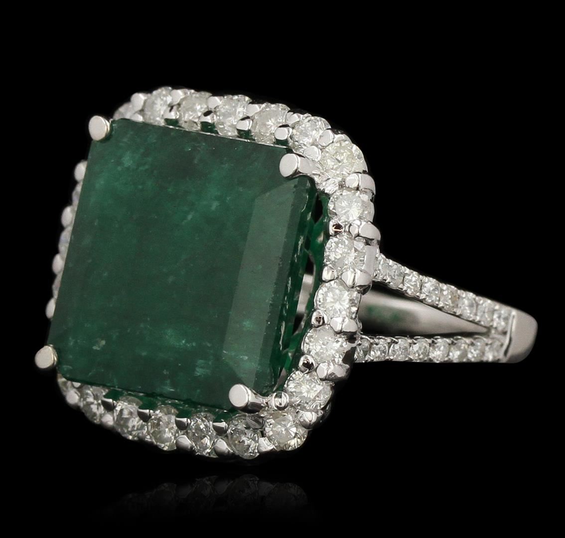One electronically tested 14KT white gold Ladies combination cast & assembled ring with a bright polish finish. Condition is new. Identified with markings of "14K". Containing: One prong set emerald standard step cut natural emerald, measuring 14.00 x 13.80 x 6.00mm, approximate weight of 8.51ct., clarity is heavily included, type III, medium dark, moderately strong, green color, (GIA G 6/4), cut is good. Colored gemstones are presumed to have been subjected to commonly used and possible undetectable color/clarity enhancement processes. Twenty-Three prong set round brilliant cut diamonds, measuring 2.00 - 2.00 x 1.20mm (depth est.) approximate total weight of 23 Stones = 0.67ct. Clarity of I-1 to I-2, Color of I - J, Cut is Good. Thirty-Two prong set round brilliant cut diamonds, measuring 1.20 - 1.20 x 0.72mm (depth est.) approximate total weight of 32 Stones = 0.20ct. Clarity of I-1 to I-2, Color of H - I, Cut is Good. Total Weight of Colored Stones 8.51ct. Total Weight of Diamonds 0.87ct. Total Weight of Ring 8.20gm. GGL Appraised at $17,995.00.