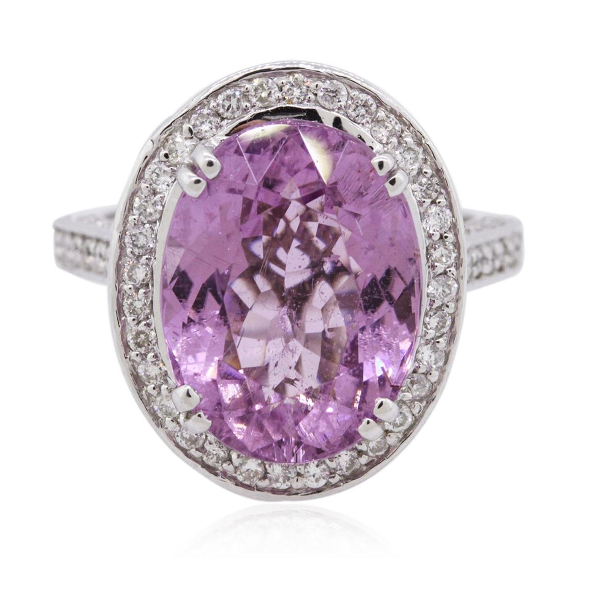 One electronically tested 14KT white gold ladies cast pink tourmaline and diamond ring with a bright polish finish. The featured pink tourmaline is set within a diamond bezel supported by a diamond set under gallery and diamond set shoulders, completed by a two millimeter wide band. Identified with markings of "14K". Condition is new, good workmanship. Containing: One prong set oval mixed cut natural pink tourmaline, measuring 14.80 x 11.15 x 7.80mm, 6%. bulge factor, approximate weight of 8.52ct., clarity is moderately included, medium dark, very slightly grayish, pink color, (GIA Pk 6/3), cut is good. Transmitting light with a minimum of distortion, transparent. Naturally occurring internal & external characteristics are present. Colored Stone Grading Report attached. Graded in the setting. This color of tourmaline is commonly irradiated to improve or change the color. Whether or not this gemstone has been irradiated cannot currently be determined. One Hundred Thirty-Eight prong set round brilliant cut diamonds, measuring 1.60 - 1.40 x 0.90mm (depth est.) approximate total weight of 138 Stones = 1.79ct. Graded in the setting. Clarity: SI-1 to I-1. Color: H - J. Total Weight of Colored Stones 8.52ct. Total Weight of Diamonds 1.79ct. Total Weight of Ring 8.98 grams. AIG Appraised at $9,435.00.