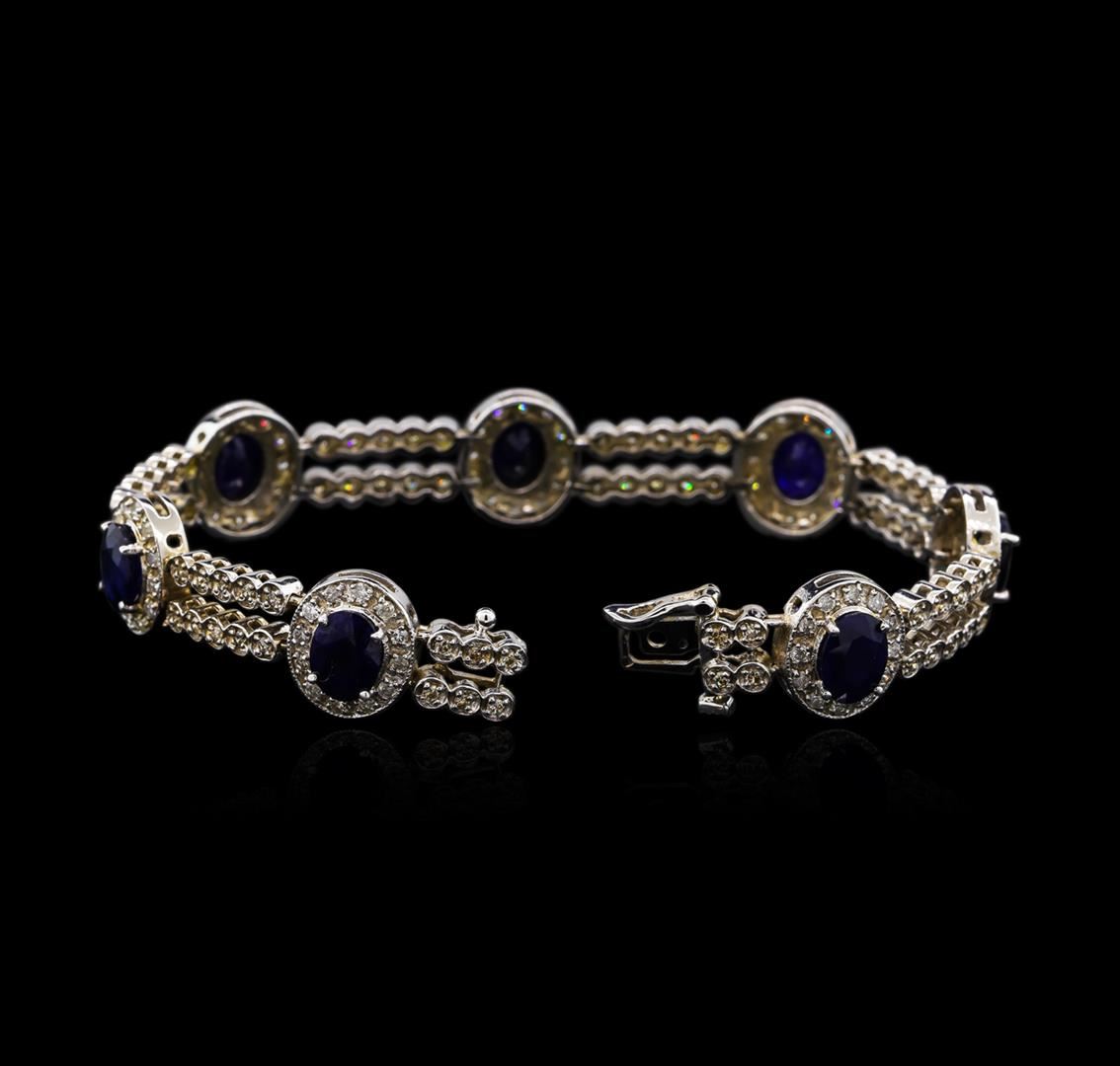 One electronically tested 14KT white gold Ladies cast bracelet with a hidden box clasp with a bright polish finish. Condition is new. Measurements: 7" in length. Containing: Seven prong set oval modified brilliant cut natural blue sapphires, measuring 7.80 x 5.90 x 3.25mm, approximate. Total Weight of 8.54ct., clarity is heavily included, type II, dark, moderately strong, blue color, (GIA B 7/4), cut is good. Colored gemstones are presumed to have been subjected to commonly used color/clarity enhancement processes. One Hundred Fifty-Four prong set round brilliant cut diamonds, measuring 1.50 - 1.50 x 0.90mm (depth est.) approximate. Total Weight of 154 Stones = 1.89ct. Clarity: SI-2 to I-2. Color: M - N, Cut is Good. Total Weight of Colored Stones 8.54ct. Total Weight of Diamonds 1.89ct. Total Weight of Bracelet 23.80 grams. GGL Appraised at $13,800.00.