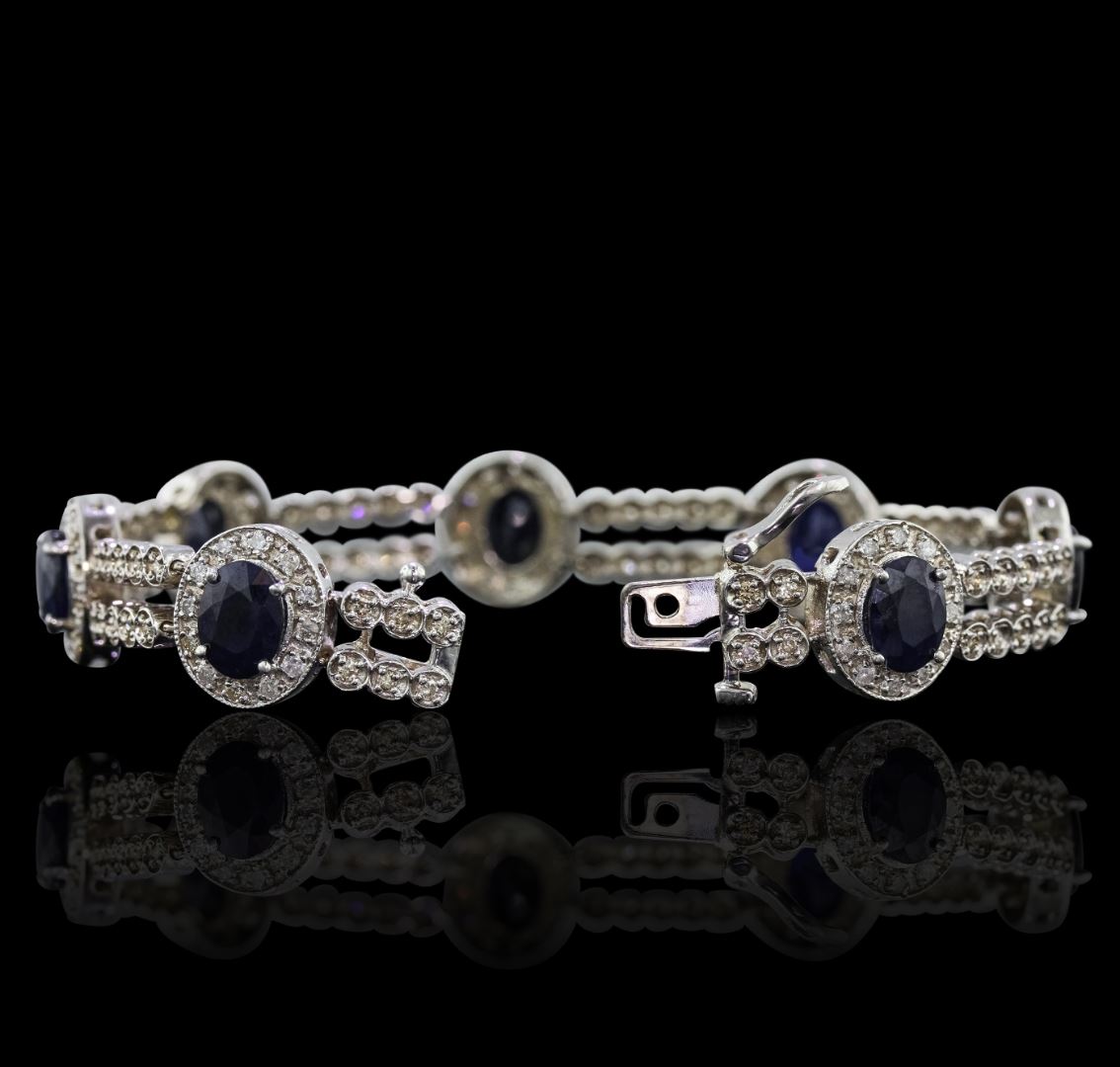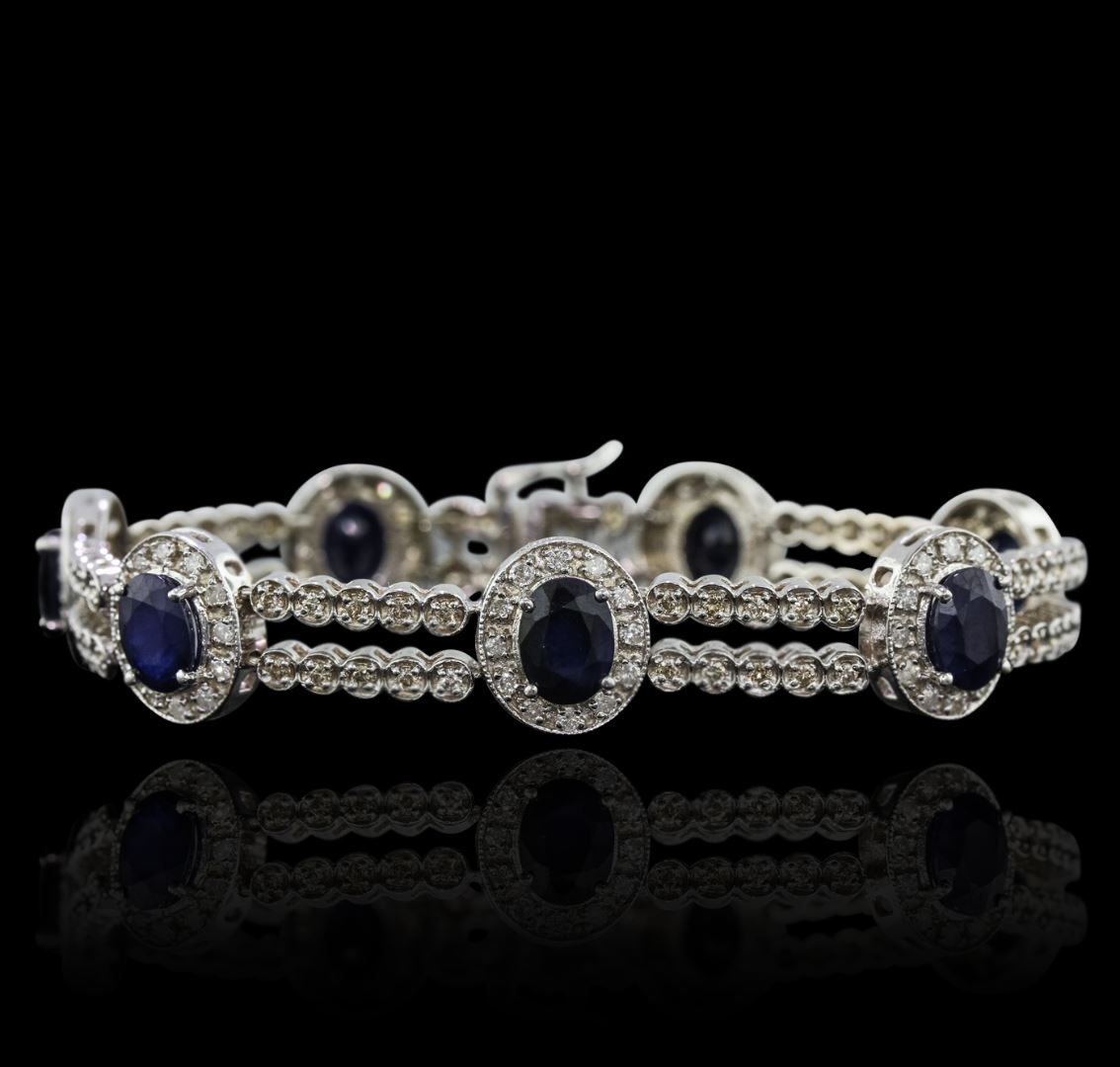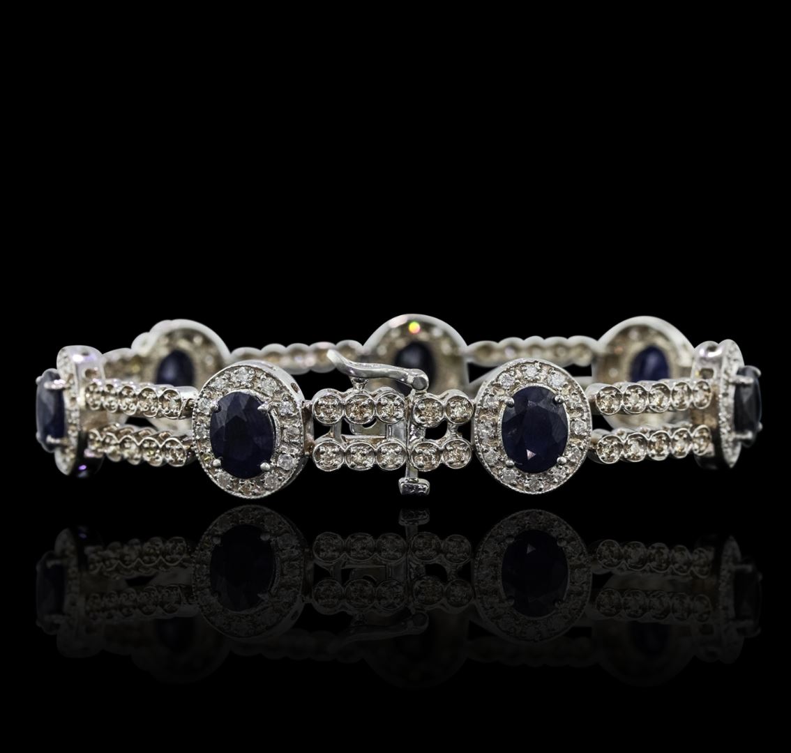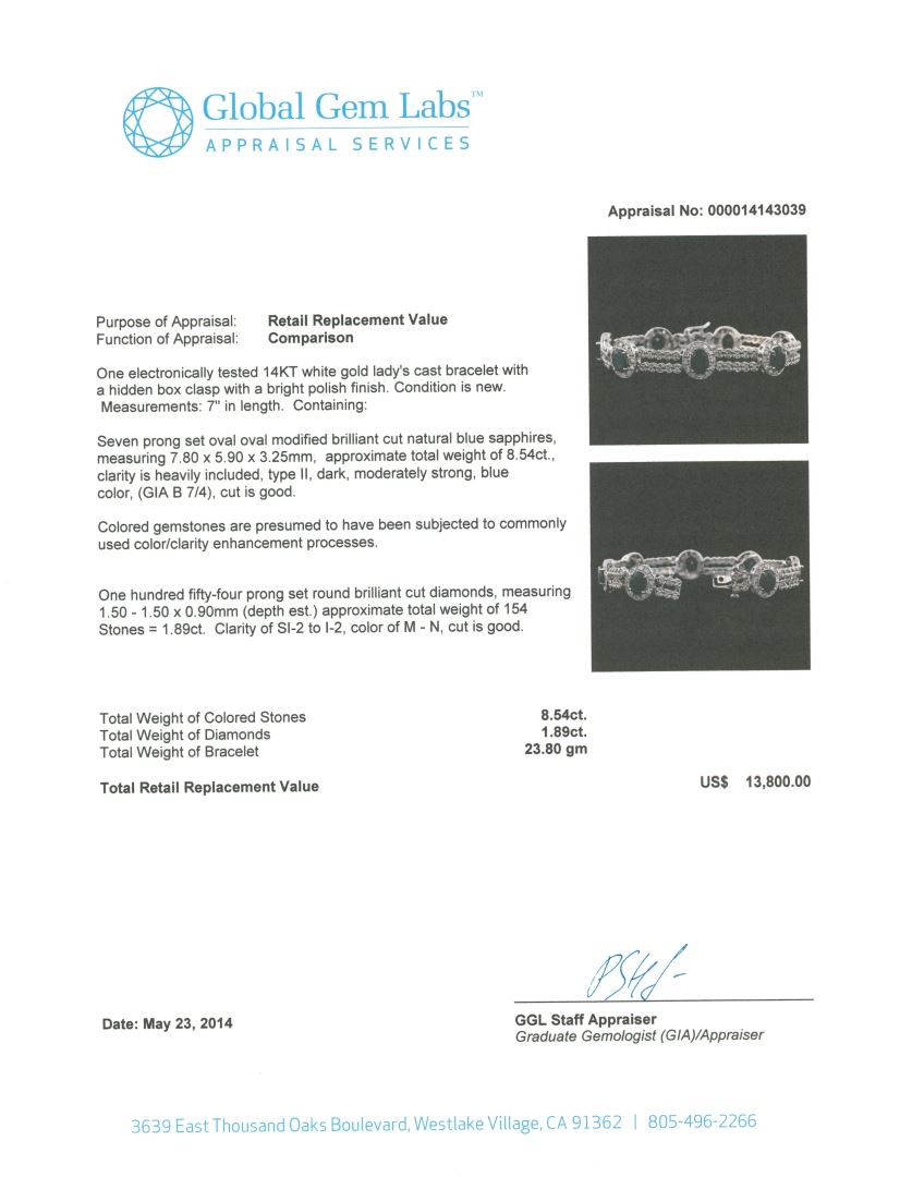 One electronically tested 14KT white gold Ladies cast bracelet with a hidden box clasp with a bright polish finish. Condition is new. Measurements: 7" in length. Containing: Seven prong set oval modified brilliant cut natural blue sapphires, measuring 7.80 x 5.90 x 3.25mm, approximate. Total Weight of 8.54ct., clarity is heavily included, type II, dark, moderately strong, blue color, (GIA B 7/4), cut is good. Colored gemstones are presumed to have been subjected to commonly used color/clarity enhancement processes. One Hundred Fifty-Four prong set round brilliant cut diamonds, measuring 1.50 - 1.50 x 0.90mm (depth est.) approximate. Total Weight of 154 Stones = 1.89ct. Clarity: SI-2 to I-2. Color: M - N, Cut is Good. Total Weight of Colored Stones 8.54ct. Total Weight of Diamonds 1.89ct. Total Weight of Bracelet 23.80 grams. GGL Appraised at $13,800.00.