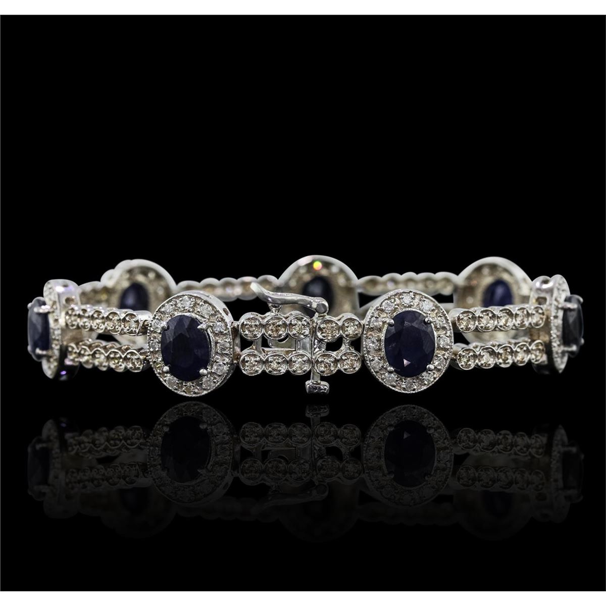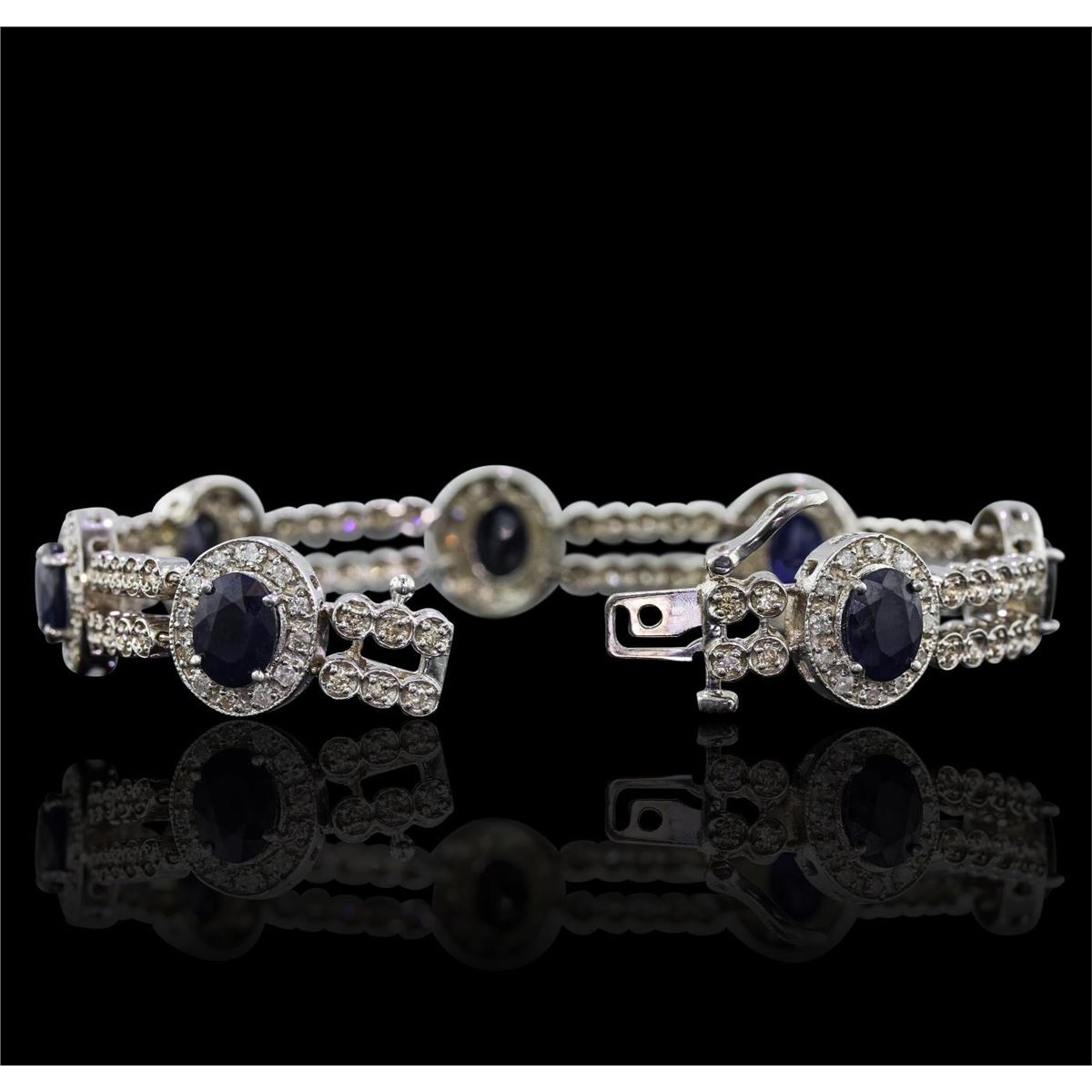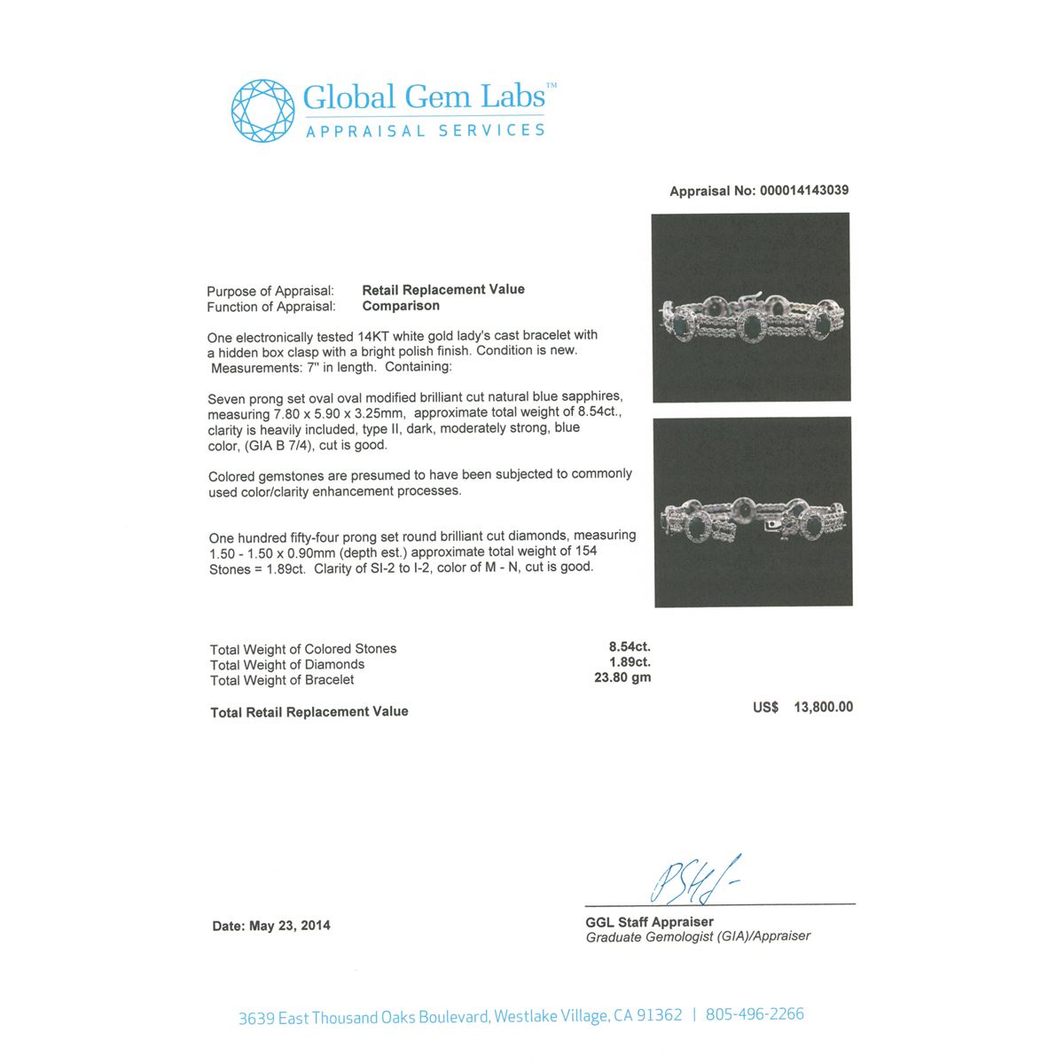 One electronically tested 14KT white gold Ladies cast bracelet with a hidden box clasp with a bright polish finish. Condition is new. Measurements: 7" in length. Containing: Seven prong set oval modified brilliant cut natural blue sapphires, measuring 7.80 x 5.90 x 3.25mm, approximate. Total Weight of 8.54ct., clarity is heavily included, type II, dark, moderately strong, blue color, (GIA B 7/4), cut is good. Colored gemstones are presumed to have been subjected to commonly used color/clarity enhancement processes. One Hundred Fifty-Four prong set round brilliant cut diamonds, measuring 1.50 - 1.50 x 0.90mm (depth est.) approximate. Total Weight of 154 Stones = 1.89ct. Clarity: SI-2 to I-2. Color: M - N, Cut is Good. Total Weight of Colored Stones 8.54ct. Total Weight of Diamonds 1.89ct. Total Weight of Bracelet 23.80 grams. GGL Appraised at $13,800.00.