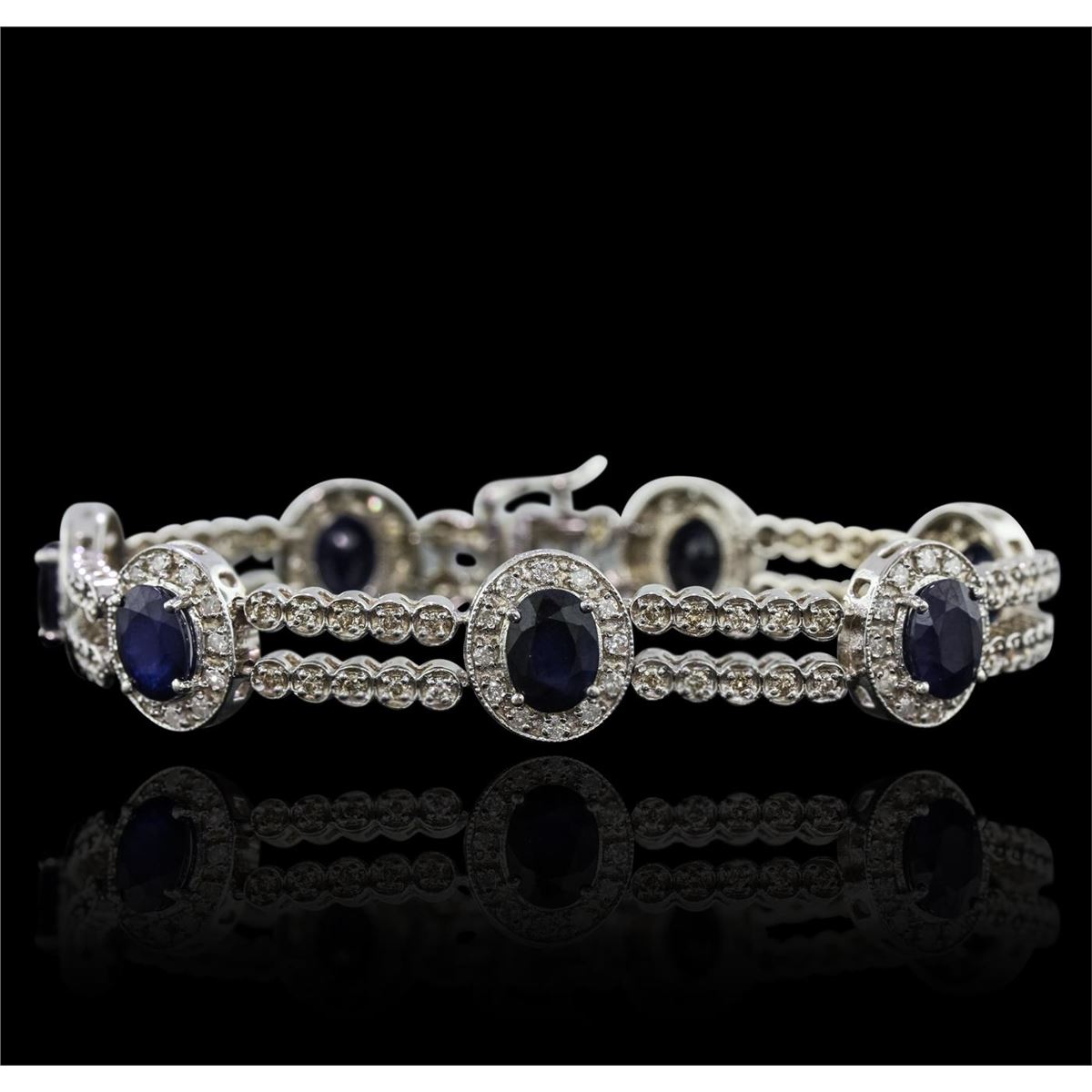 One electronically tested 14KT white gold Ladies cast bracelet with a hidden box clasp with a bright polish finish. Condition is new. Measurements: 7" in length. Containing: Seven prong set oval modified brilliant cut natural blue sapphires, measuring 7.80 x 5.90 x 3.25mm, approximate. Total Weight of 8.54ct., clarity is heavily included, type II, dark, moderately strong, blue color, (GIA B 7/4), cut is good. Colored gemstones are presumed to have been subjected to commonly used color/clarity enhancement processes. One Hundred Fifty-Four prong set round brilliant cut diamonds, measuring 1.50 - 1.50 x 0.90mm (depth est.) approximate. Total Weight of 154 Stones = 1.89ct. Clarity: SI-2 to I-2. Color: M - N, Cut is Good. Total Weight of Colored Stones 8.54ct. Total Weight of Diamonds 1.89ct. Total Weight of Bracelet 23.80 grams. GGL Appraised at $13,800.00.