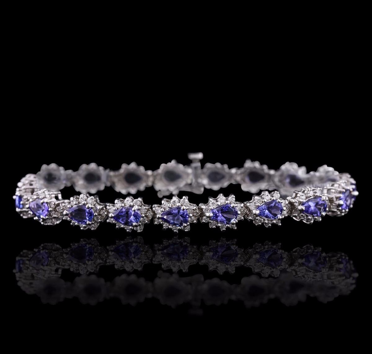 One electronically tested 14KT white gold Ladies combination cast & assembled bracelet with a safety clasp with a bright polish finish. Condition is new. Measurements: 7" in length. Identified with markings of "14K". Containing: Nineteen prong set pear modified brilliant cut natural tanzanites, measuring 5.99 x 4.00 x 2.78mm, approximate. Total Weight of 8.55ct., clarity is eye clean, type I, medium light, very slightly grayish, violet color, (GIA V 4/3), cut is good. Five Hundred Nine prong set round brilliant cut diamonds, measuring 1.30 - 1.30 x 0.78mm (depth est.) approximate. Total Weight of 509 Stones = 4.07ct. Clarity: I-1 to I-2. Color: J - K, Cut is Good. Colored gemstones are presumed to have been subjected to commonly used enhancement processes. All diamonds and colored gemstones are graded in the mounting, unless otherwise stated. Total Weight of Colored Stones 8.55ct. Total Weight of Diamonds 4.07ct. Total Weight of Bracelet 17.20 grams. GGL Appraised at $17,310.00.