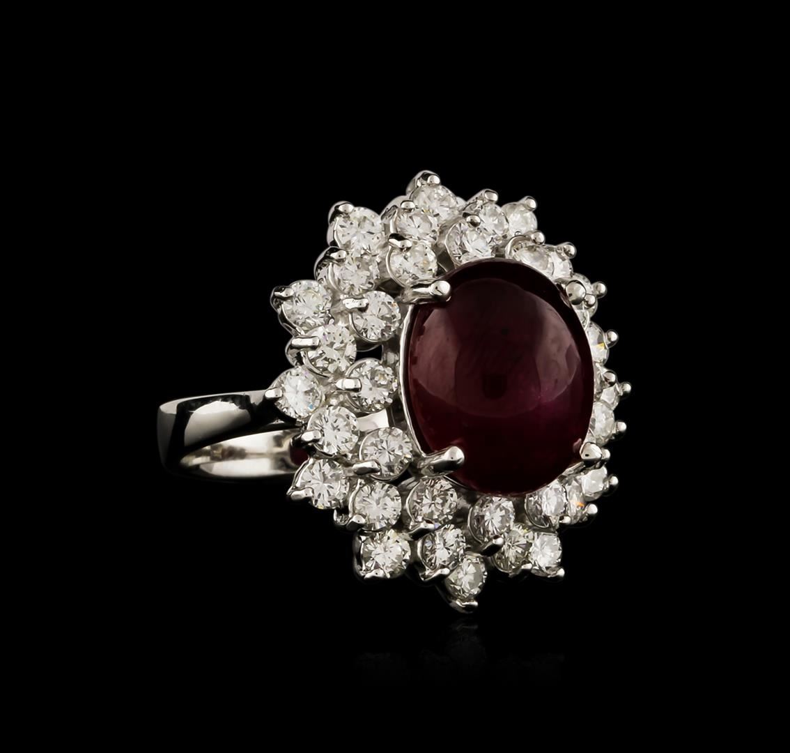 One electronically tested 14KT white gold ladies cast ruby and diamond ring with a bright polish finish. Identified with markings of "14K". Condition is new. Containing: One prong set oval cabochon cut natural ruby, measuring 12.70 x 10.60 x 5.90mm, approximate weight of 8.69ct., clarity is heavily included, medium, moderately strong, strongly purplish red color, (GIA stpR 5/4), cut is good. Thirty-Seven prong set round brilliant cut diamonds, measuring 2.80 - 2.80 x 1.68mm (depth est.) approximate total weight of 37 Stones = 2.97ct. Clarity: SI-1 to SI-2. Color: J - K, Cut is Good. Colored gemstones are presumed to have been subjected to commonly used enhancement processes, All diamonds and colored gemstones are graded in the mounting, unless otherwise stated. Total Weight of Colored Stones 8.69ct. Total Weight of Diamonds 2.97ct. Total Weight of Ring 11.30 grams. GGL Appraised at $7,690.00.
