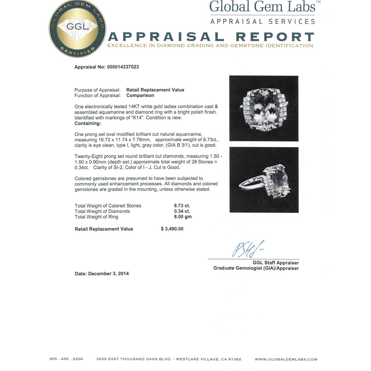 One electronically tested 14KT white gold ladies combination cast & assembled aquamarine and diamond ring with a bright polish finish. Identified with markings of "K14". Condition is new. Containing: One prong set oval modified brilliant cut natural aquamarine, measuring 16.72 x 11.74 x 7.79mm, approximate weight of 8.73ct., clarity is eye clean, type I, light, gray color, (GIA B 3/1), cut is good. Twenty-Eight prong set round brilliant cut diamonds, measuring 1.50 - 1.50 x 0.90mm (depth est.) approximate total weight of 28 Stones = 0.34ct. Clarity: SI-2. Color: I - J, Cut is Good. Colored gemstones are presumed to have been subjected to commonly used enhancement processes. All diamonds and colored gemstones are graded in the mounting, unless otherwise stated. Total Weight of Colored Stones 8.73ct. Total Weight of Diamonds 0.34ct. Total Weight of Ring 8.00 grams. GGL Appraised at $3,490.00.