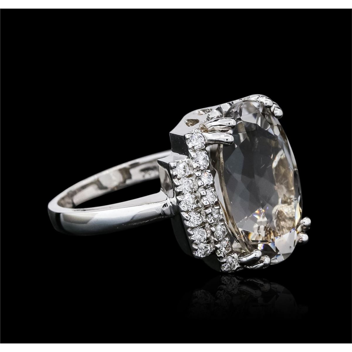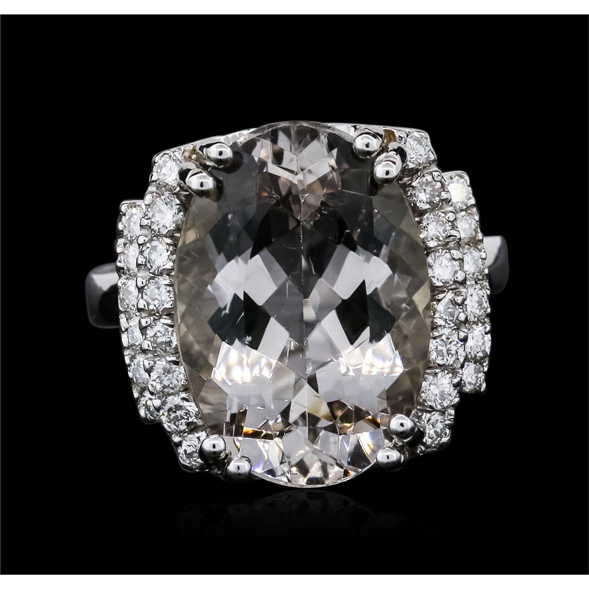 One electronically tested 14KT white gold ladies combination cast & assembled aquamarine and diamond ring with a bright polish finish. Identified with markings of "K14". Condition is new. Containing: One prong set oval modified brilliant cut natural aquamarine, measuring 16.72 x 11.74 x 7.79mm, approximate weight of 8.73ct., clarity is eye clean, type I, light, gray color, (GIA B 3/1), cut is good. Twenty-Eight prong set round brilliant cut diamonds, measuring 1.50 - 1.50 x 0.90mm (depth est.) approximate total weight of 28 Stones = 0.34ct. Clarity: SI-2. Color: I - J, Cut is Good. Colored gemstones are presumed to have been subjected to commonly used enhancement processes. All diamonds and colored gemstones are graded in the mounting, unless otherwise stated. Total Weight of Colored Stones 8.73ct. Total Weight of Diamonds 0.34ct. Total Weight of Ring 8.00 grams. GGL Appraised at $3,490.00.