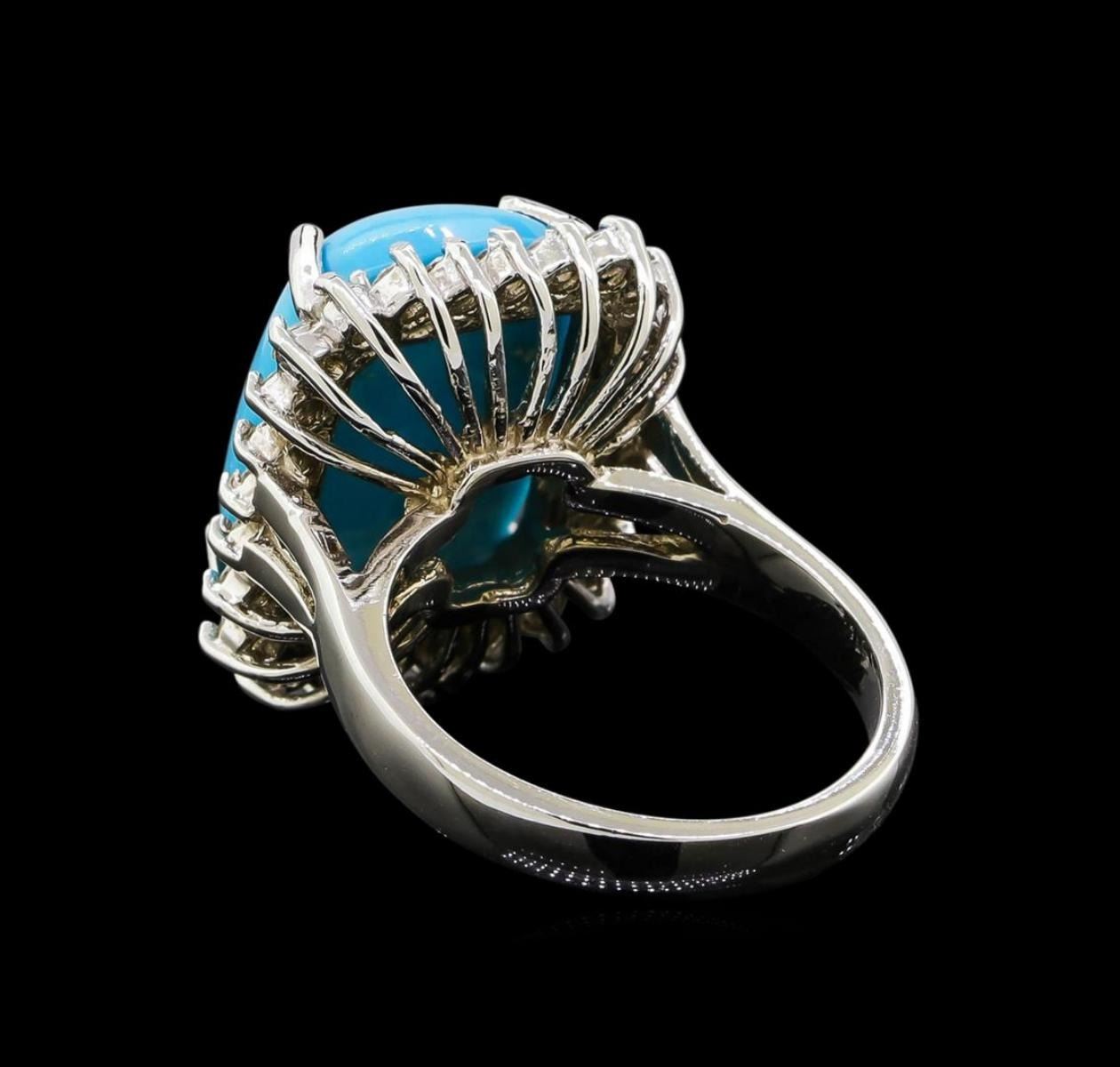 One electronically tested 14KT white gold ladies cast turquoise and diamond ring with a bright polish finish. Identified with markings of "14K". Condition is new. Containing: One prong set rectangular cabochon cut natural turquoise, measuring 15.85 x 12.00 x 6.20mm, approximate weight of 8.79ct., clarity is heavily included, medium light, moderately strong, blue color, (GIA B 4/4), cut is good. Twenty-Six prong set round brilliant cut diamonds, measuring 1.90 - 1.90 x 1.14mm (depth est.) approximate total weight of 26 Stones = 0.65ct. Clarity: SI-1 to SI-2. Color: I - J, Cut is Good. Colored gemstones are presumed to have been subjected to commonly used enhancement processes. All diamonds and colored gemstones are graded in the mounting, unless otherwise stated. Total Weight of Colored Stones 8.79ct. Total Weight of Diamonds 0.65ct. Total Weight of Ring 8.90 grams. GGL Appraised.